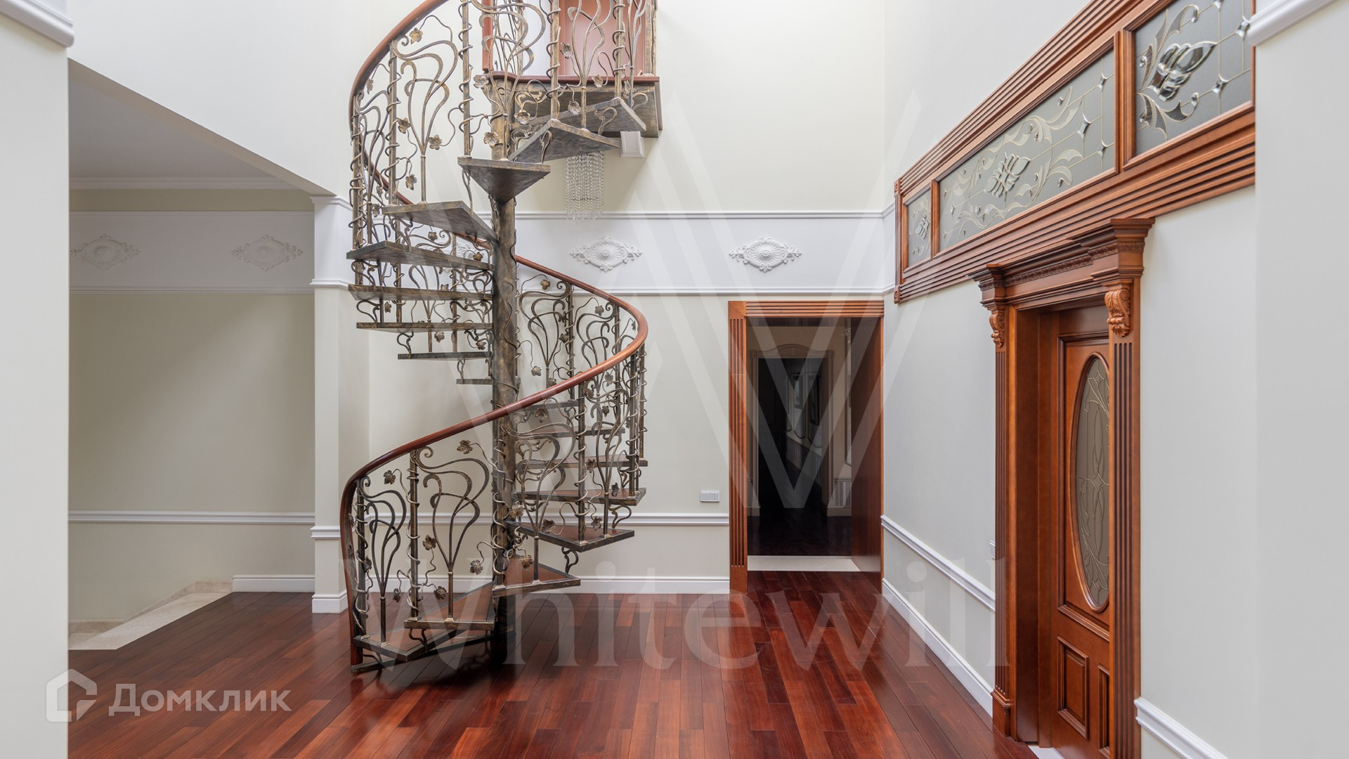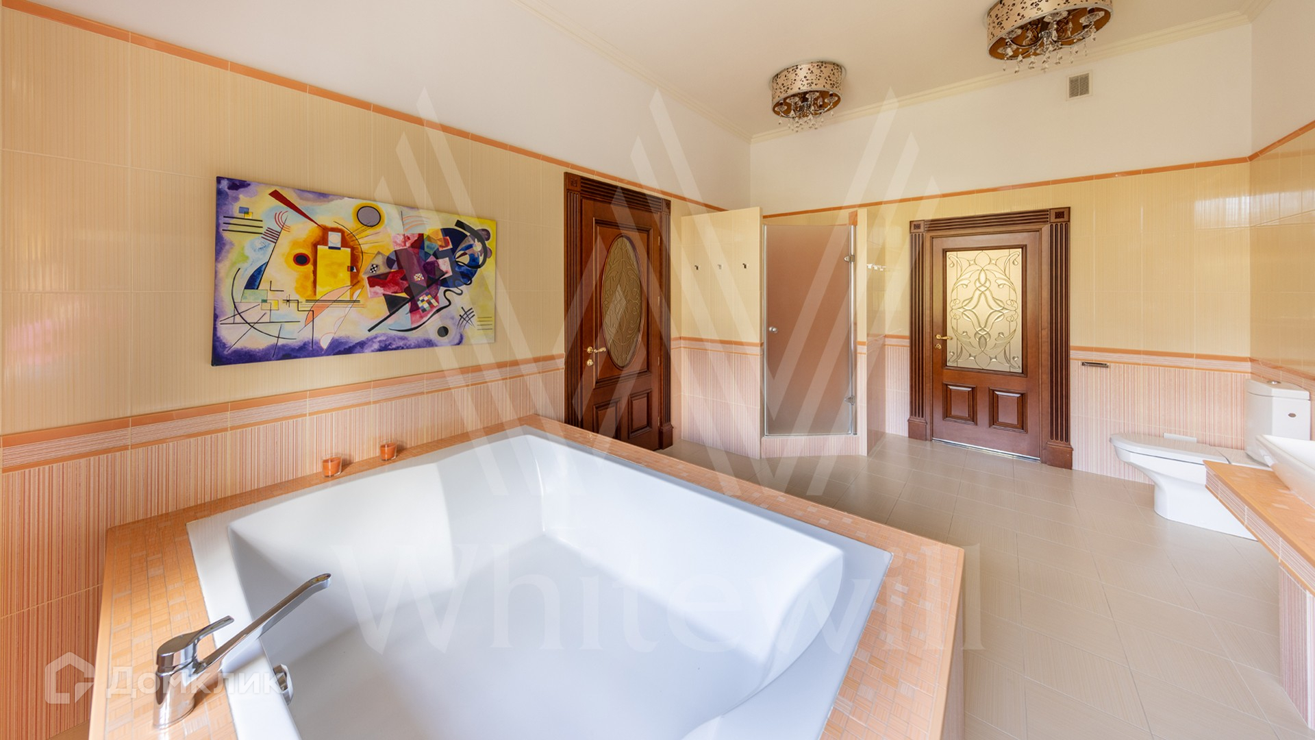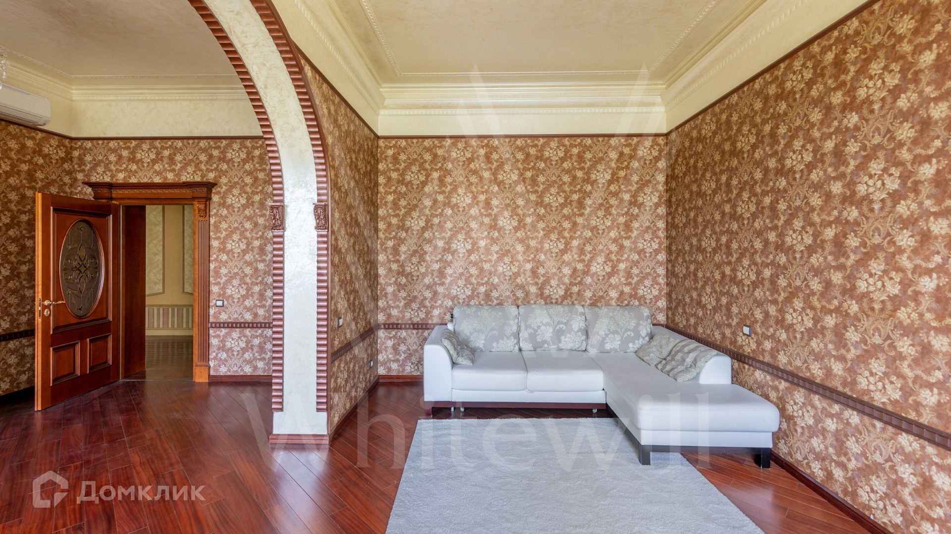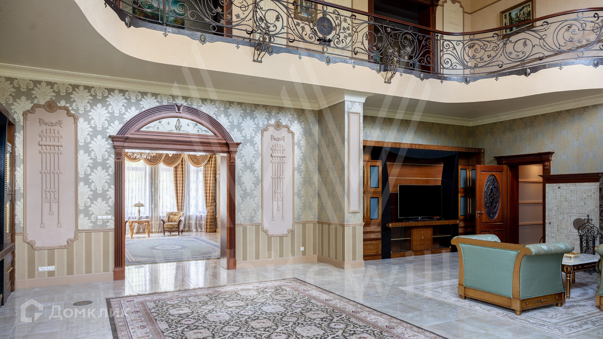ID 11 773. Семёнково. Загородный особняк в стиле русского модерна площадью 2009 м² построен на просторном участке 0,9 гектара с собственным озером. Фасад дома облицован бежевой штукатуркой, декорирован панно, рустовкой и коваными элементами. В отделке интерьера использованы светлые, теплые оттенки, создающие атмосферу уюта. Планировкой резиденции предусмотрены 3 спальни, 2 гостиные, одна из которых с камином и вторым светом, кухня, 2 столовые, кабинет и SPA-зона с бассейном длиной 16 метров, хаммамом и сауной. На территории построены 4 гаража, гостевой дом, летний домик, беседка и зона барбекю, а также обустроены парк, сад, фонтан и паркинг. На участке с 2-мя въездами выполнены ландшафтный дизайн и дренажные работы, установлена система автополива, вымощены дорожки и оборудовано уличное освещение.
