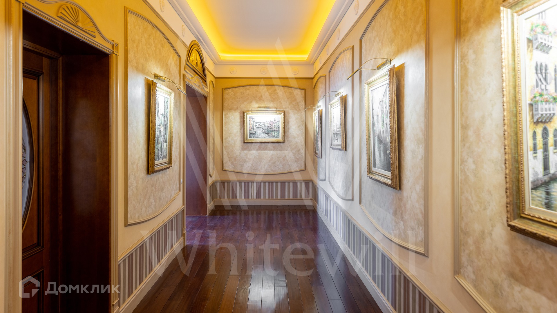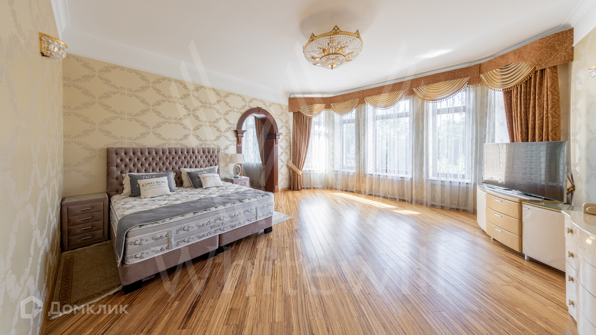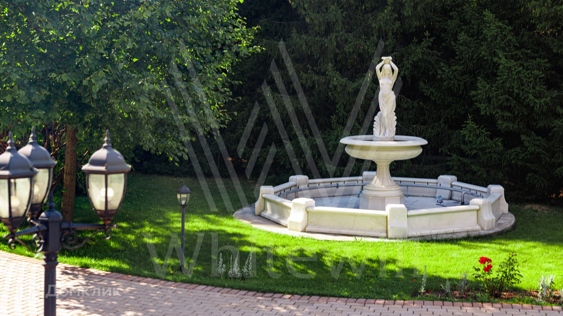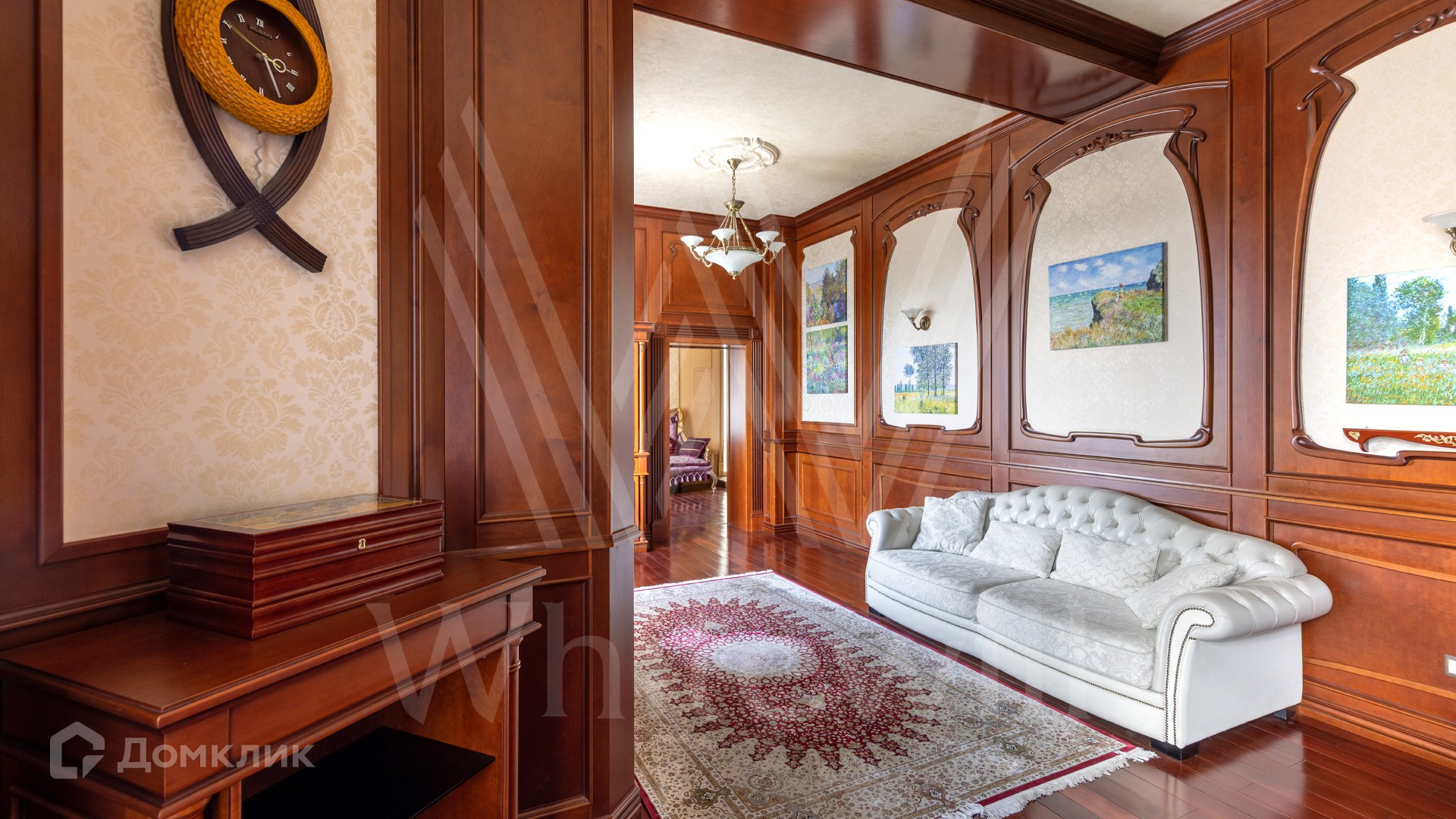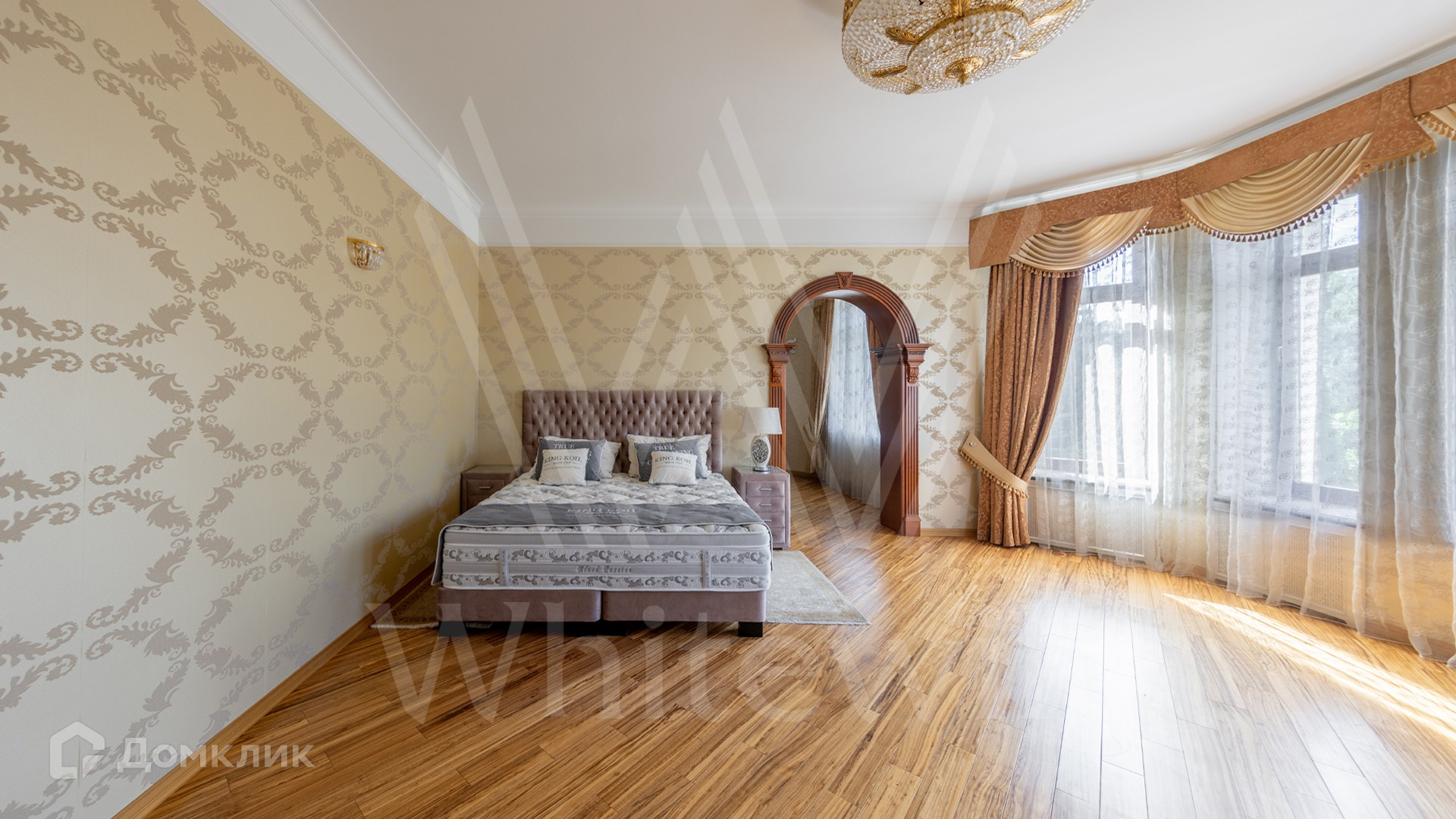 ID 11 773. Семёнково. Загородный особняк в стиле русского модерна площадью 2009 м² построен на просторном участке 0,9 гектара с собственным озером. Фасад дома облицован бежевой штукатуркой, декорирован панно, рустовкой и коваными элементами. В отделке интерьера использованы светлые, теплые оттенки, создающие атмосферу уюта. Планировкой резиденции предусмотрены 3 спальни, 2 гостиные, одна из которых с камином и вторым светом, кухня, 2 столовые, кабинет и SPA-зона с бассейном длиной 16 метров, хаммамом и сауной. На территории построены 4 гаража, гостевой дом, летний домик, беседка и зона барбекю, а также обустроены парк, сад, фонтан и паркинг. На участке с 2-мя въездами выполнены ландшафтный дизайн и дренажные работы, установлена система автополива, вымощены дорожки и оборудовано уличное освещение.