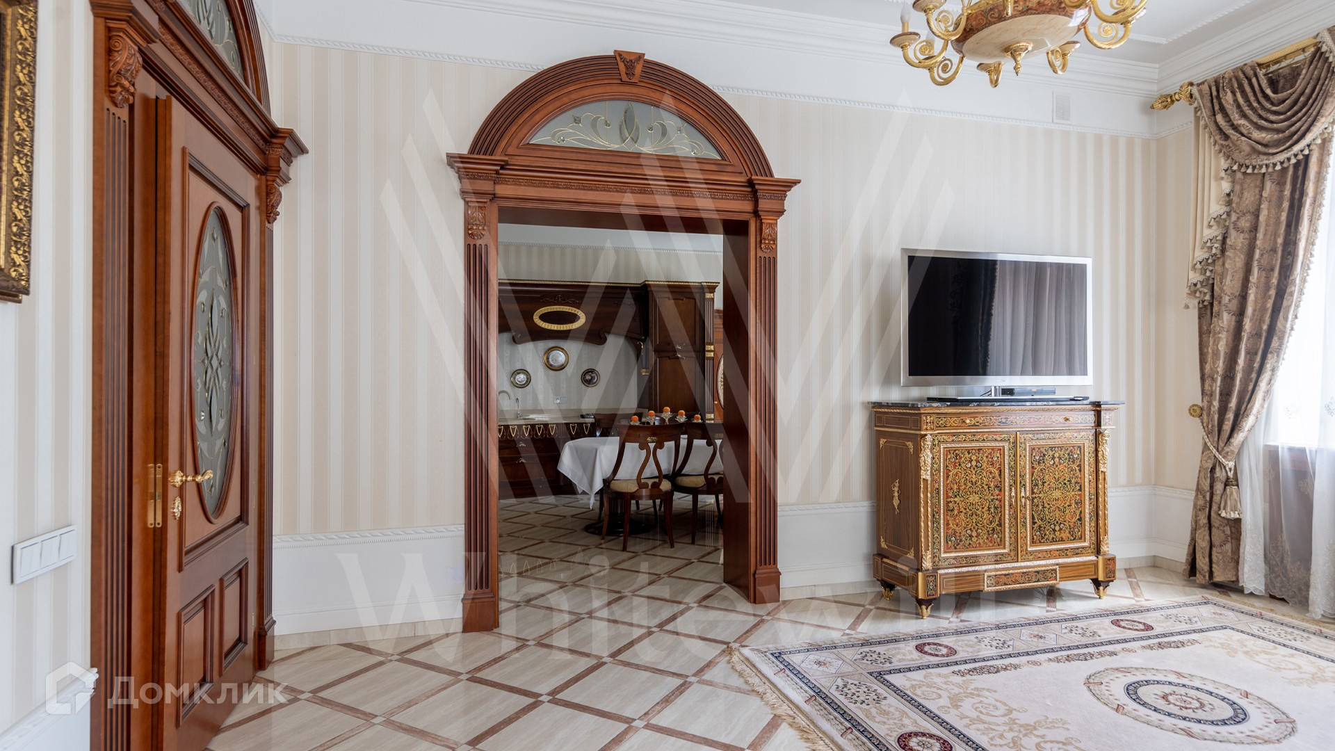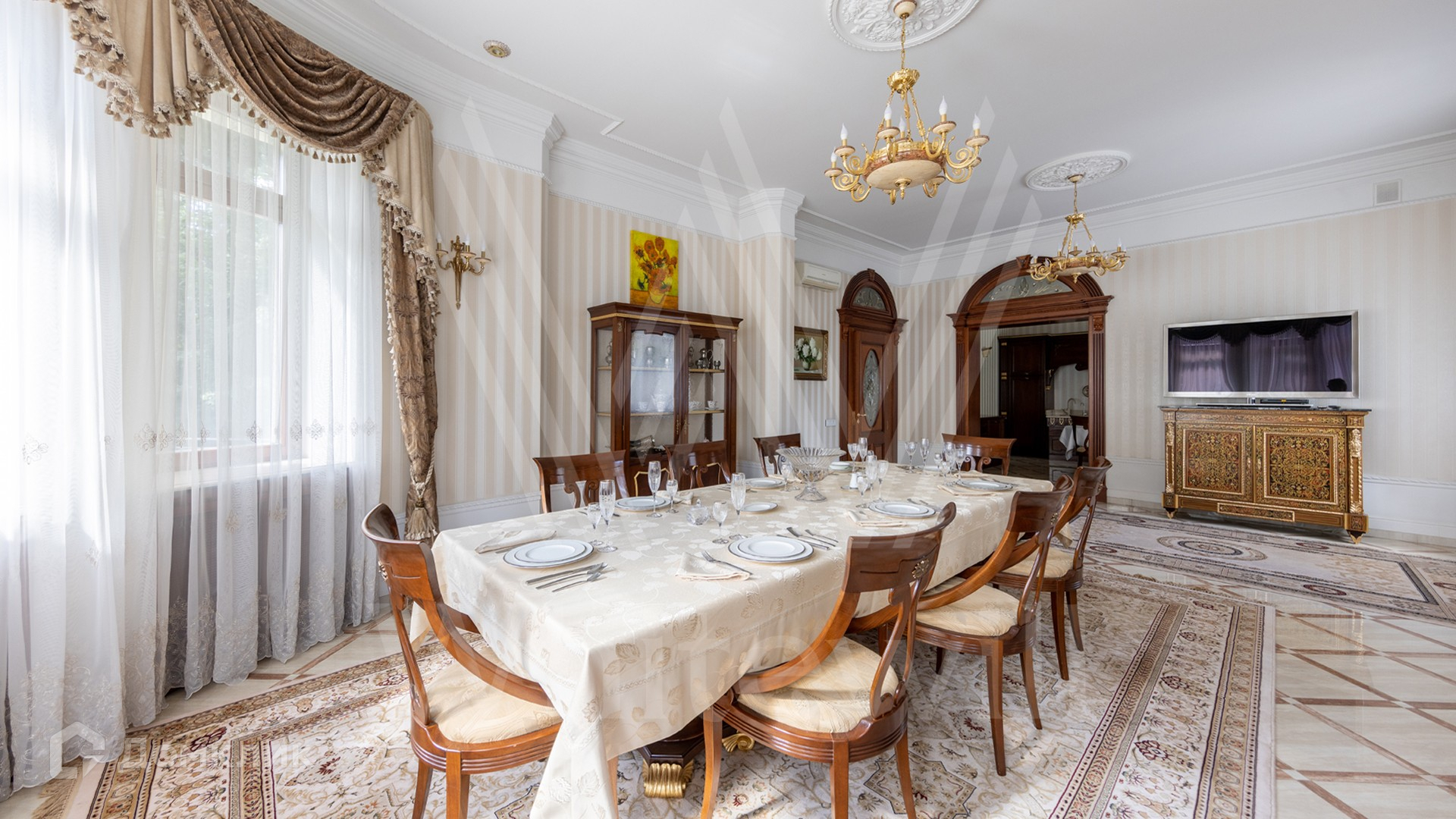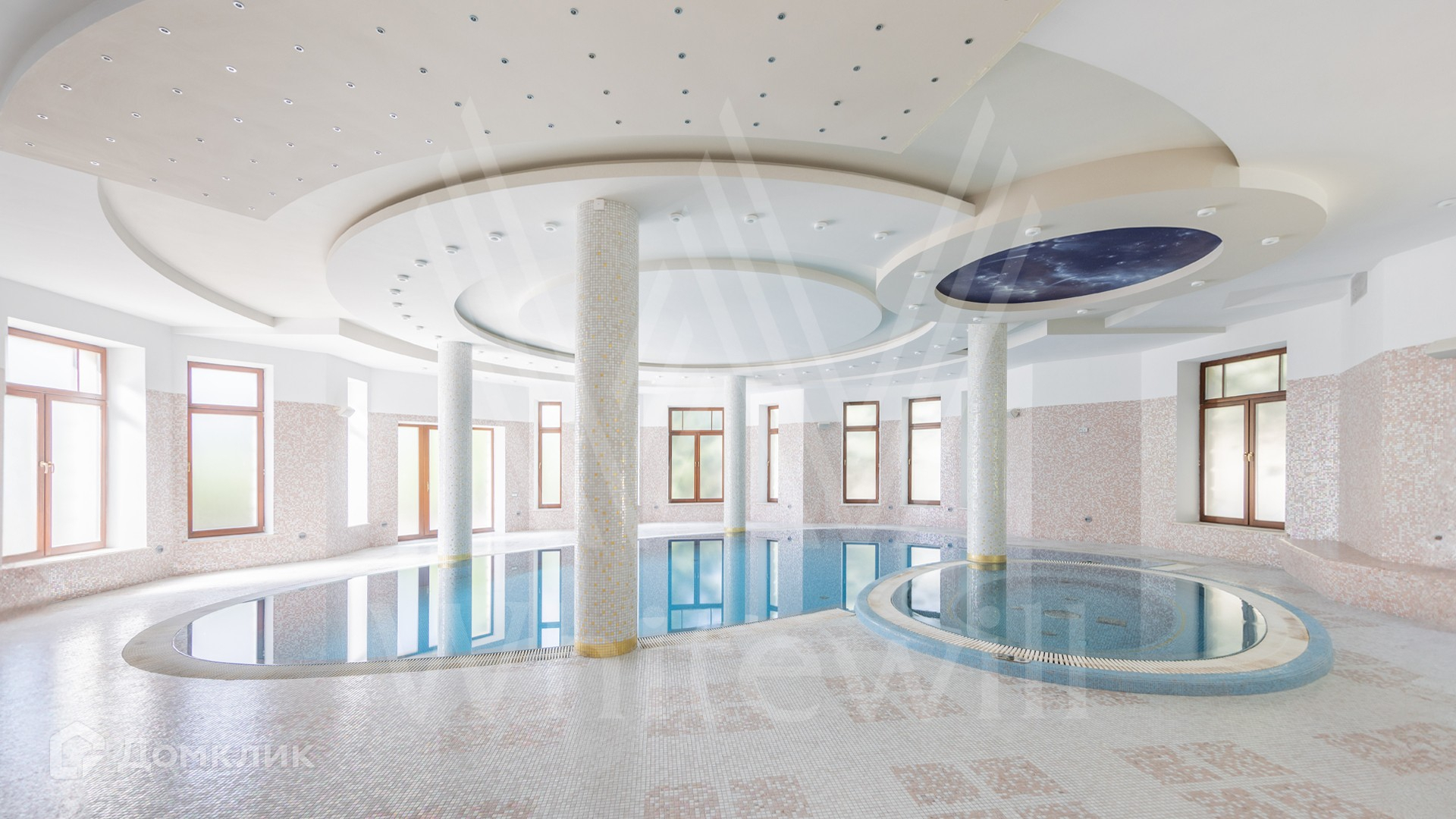 1-й уровень: 2 гостиные, 2 столовые, кухня, 2 гардеробные, SPA-зона с 2-мя бассейнами, хаммамом, сауной, комнатой отдыха и массажной, тренажерный зал, кинотеатр, зал для танцев.
