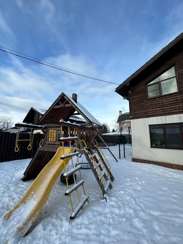* Во дворе установлен большой детский игровой комплекс (2 качелей, боксерская груша, мини скалодром, кольца, канат, домик с лестницами, горка)
