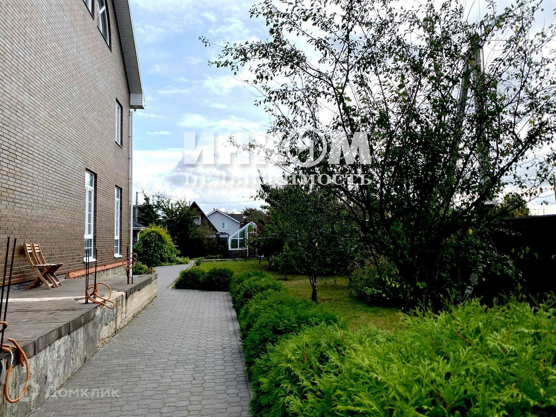 Участок правильной прямоугольной формы, на участке плодовые деревья, кустарники, хвойные деревья и кустарники, подготовка для фонтана, теплица, вольеры для собак, перед домом площадка выложена брусчаткой.
