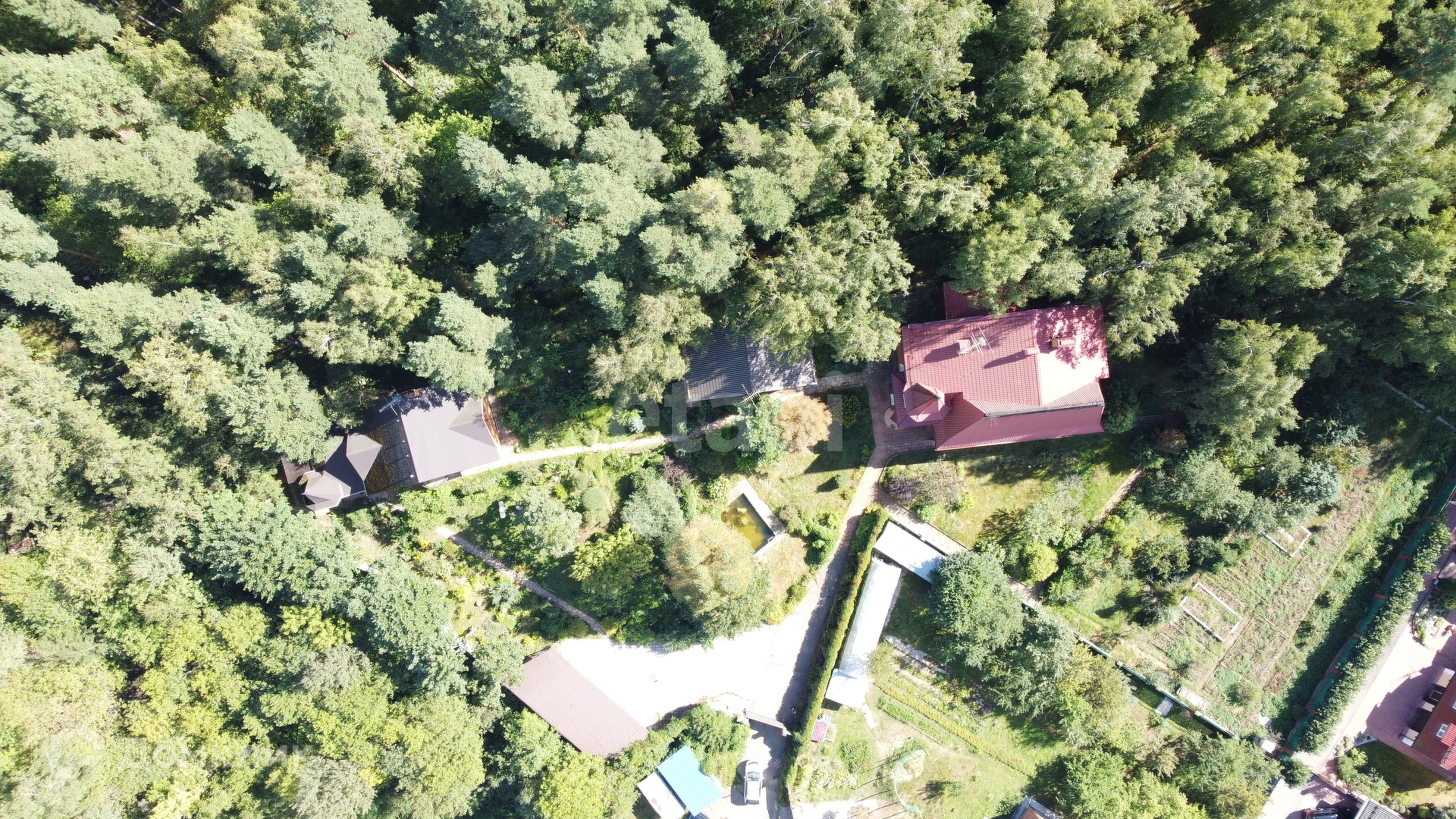 Усадьба совмещена из двух участков 23 и 12 соток. На территории усадьбы имеются три жилых дома: 540 кв. м., 240 кв. м. и гостевой домик на 60 кв. м.