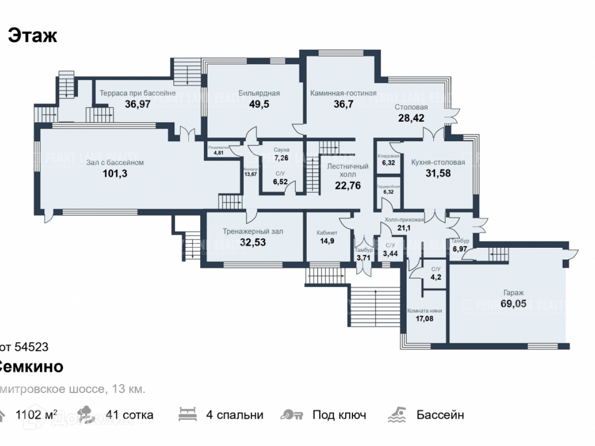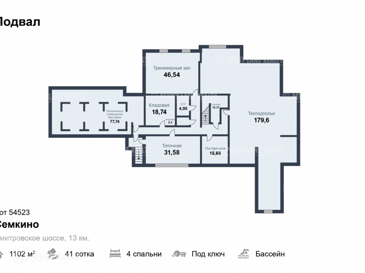 Цокольный этаж: коридор, тренажерный зал, котельная, с/у, домашний кинотеатр, 2 кладовые, тех. помещение бассейна.