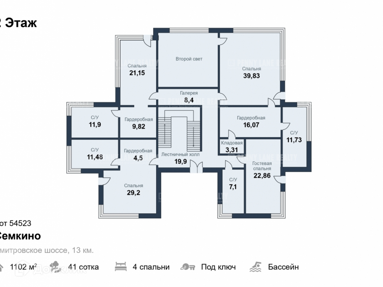 2 этаж: холл, галерея, 4 спальни с балконами, 4 с/у, 3 гардероба.