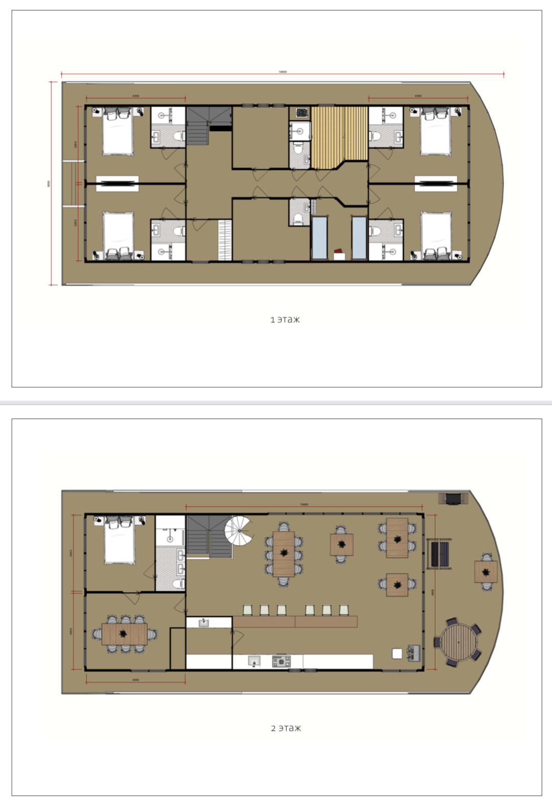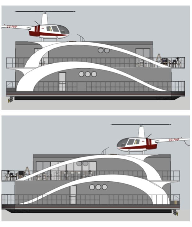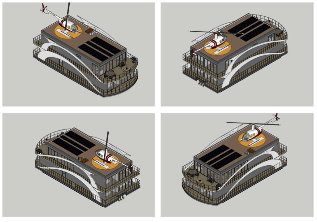 Общая площадь тёплых помещений 212 м², четыре номера с индивидуальными с/у по 14,6 м², номер категории «Люкс» 29 м², каюта капитана/персонала 6,5 м², сауна 6 м², два общих с/у по 1 м², коридоры 24 м², ресторан-бар 70 м². На крыше оборудована вертолётная площадка.