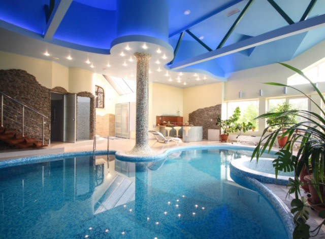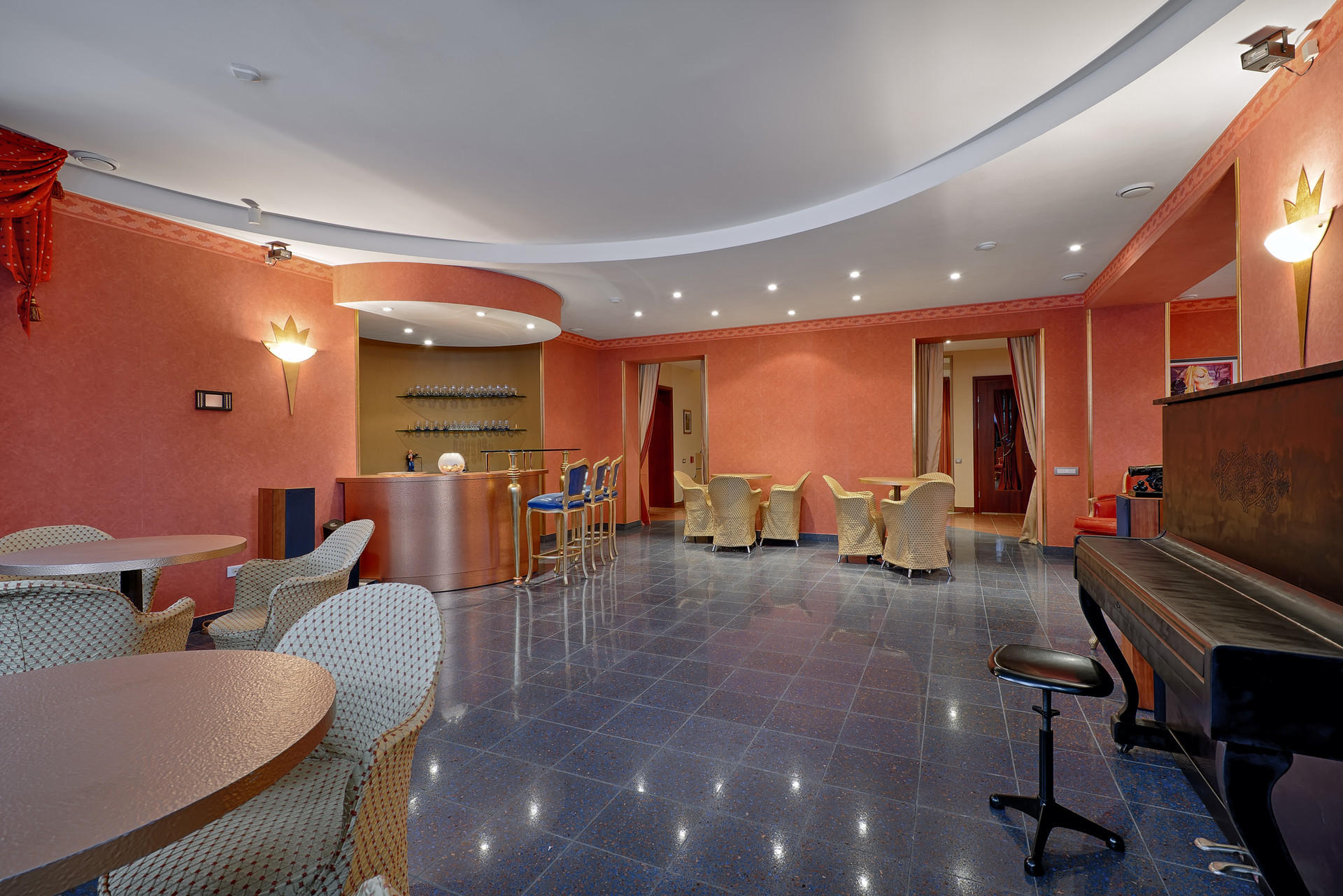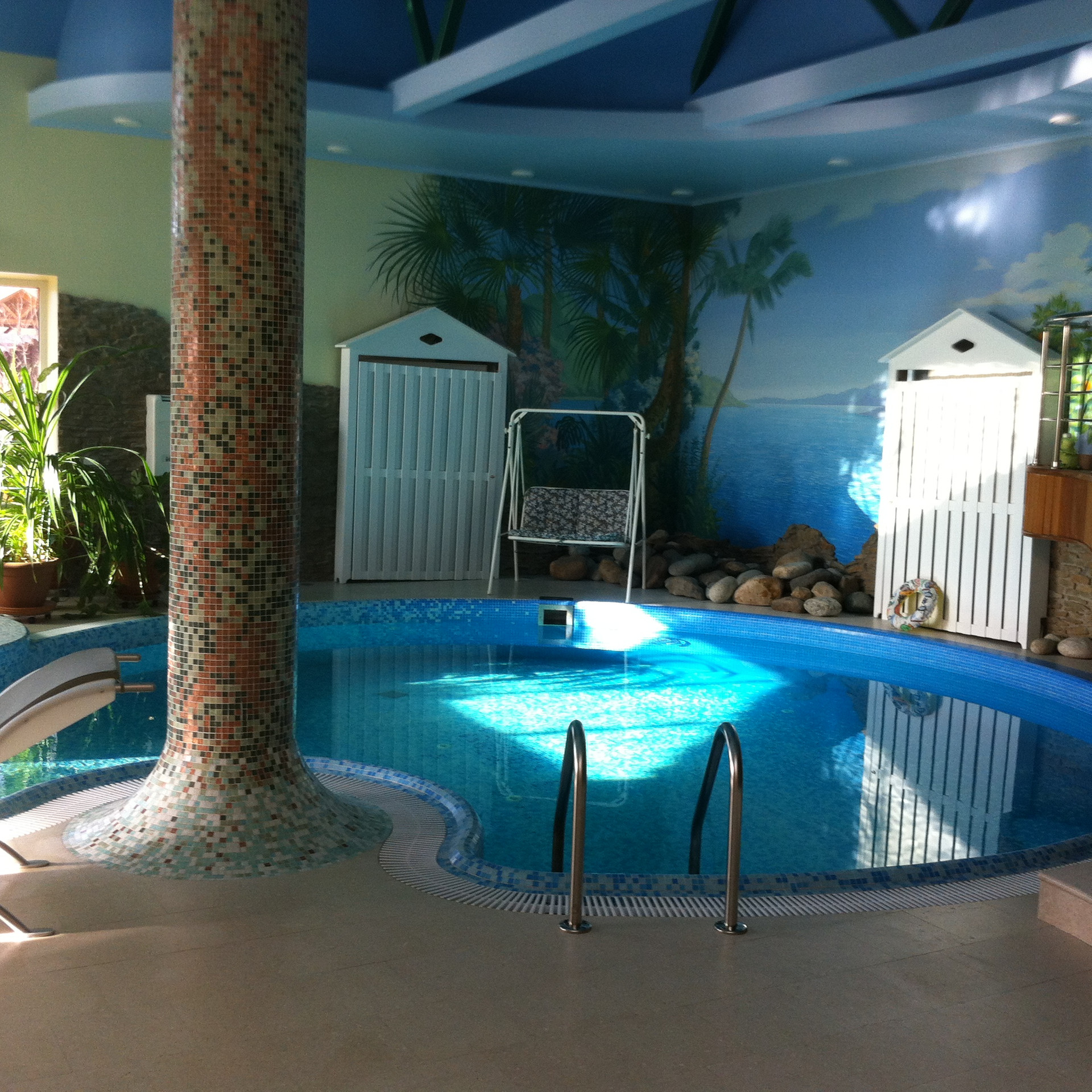 Цоколь: БАССЕЙН (90кв.м) оснащен противотоком, системой вентиляции и осушения воздуха, отдельным котлом, есть ВЫХОД во двор; бар со всей бытовой техникой (в т.ч. посудомоечной машиной), шезлонги, спортивные тренажеры, терраса со столиками, туалет, душкабина, постирочная (со стиральной и сушильной машинами, гладилкой), комната для персонала, БАНКЕТНЫЙ ЗАЛ с пианино, БАРОМ и столиками, оснащен светомузыкой и дымовой пушкой.