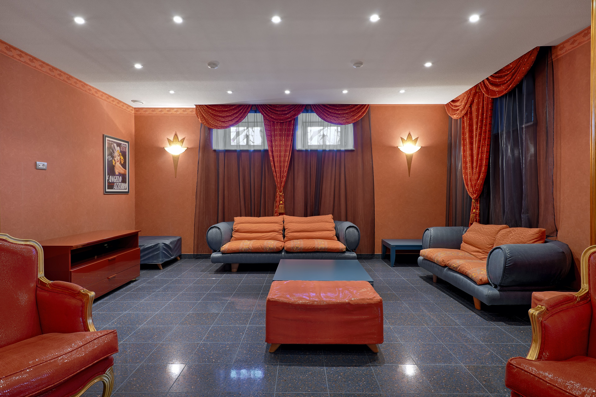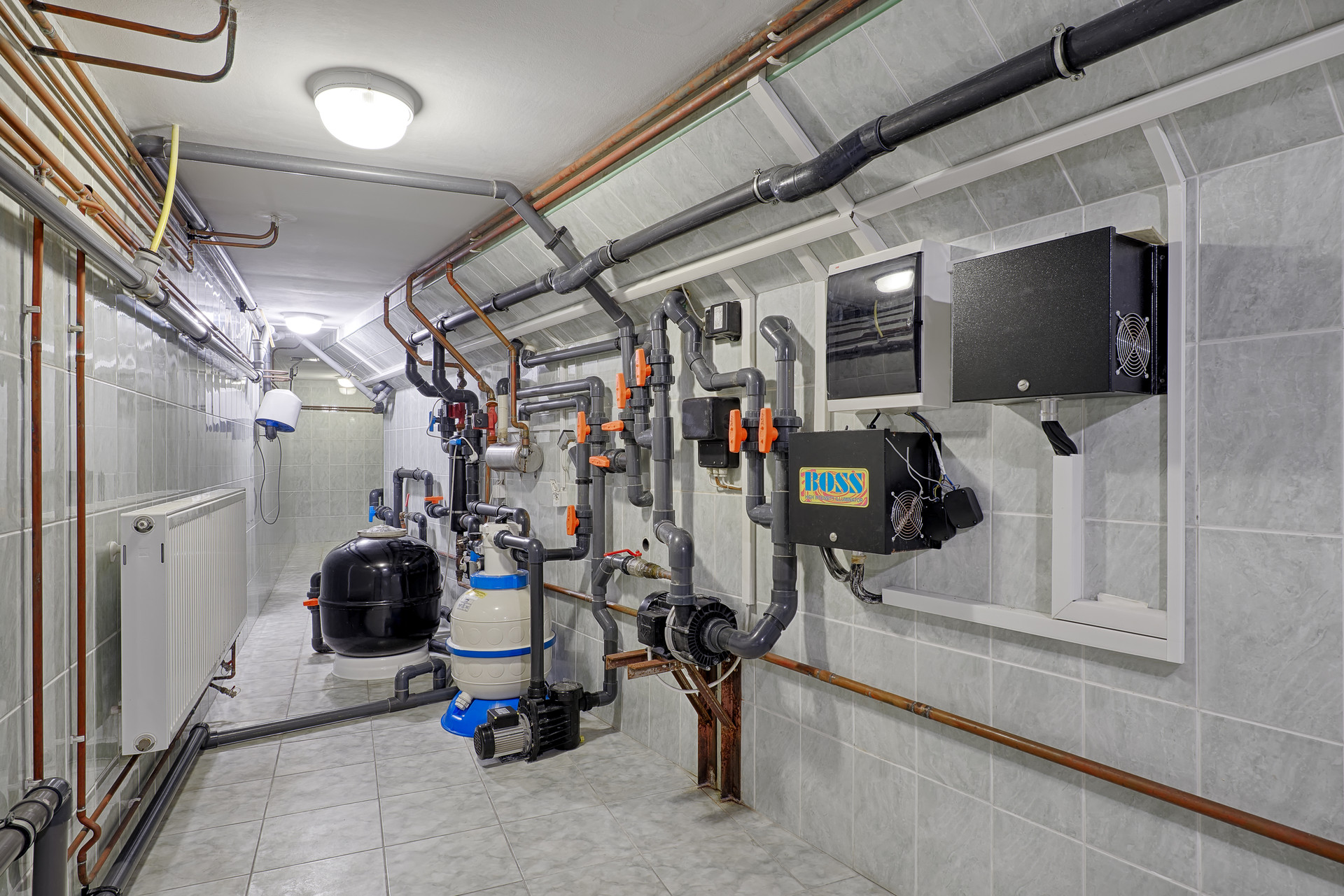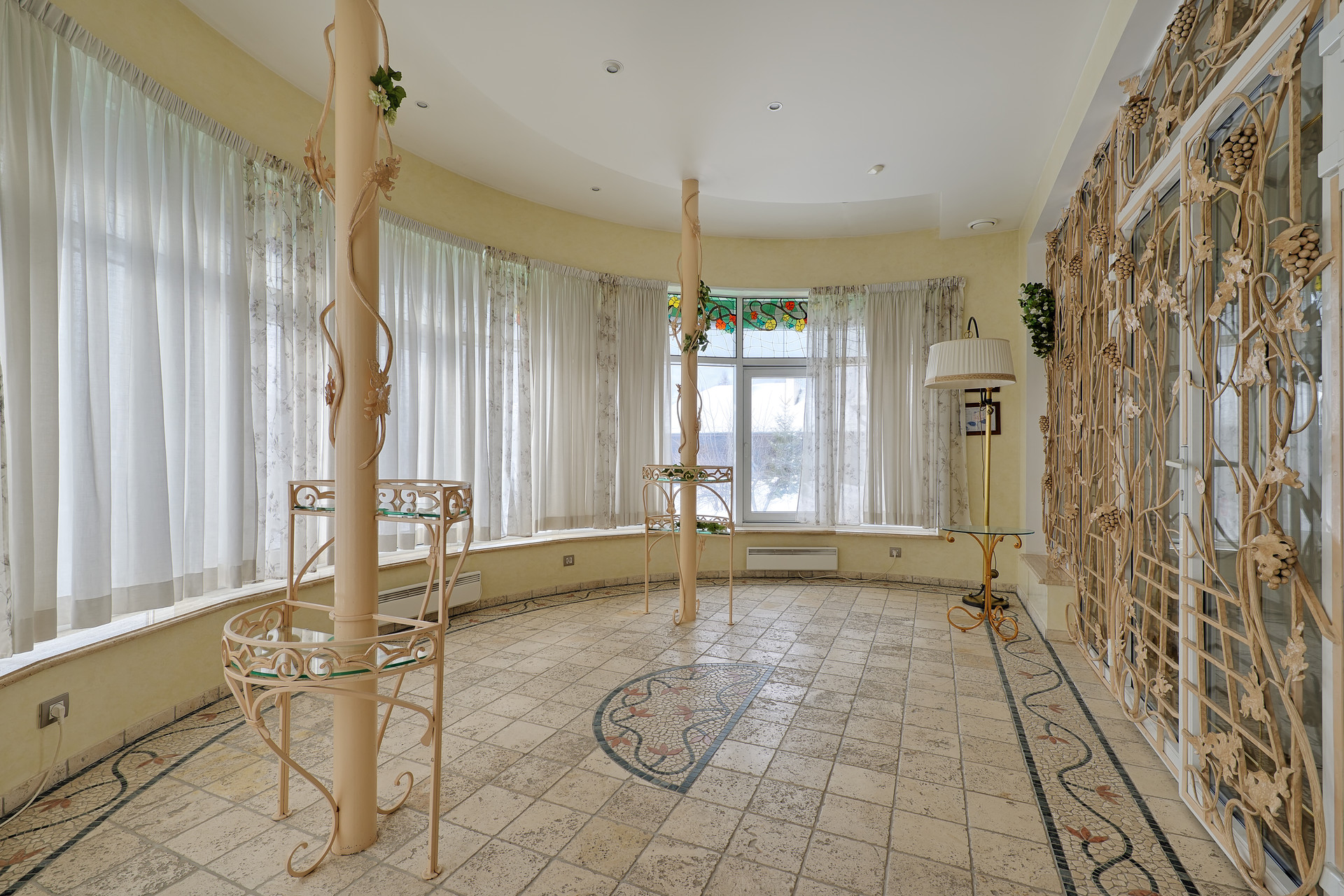 Цоколь: БАССЕЙН (90кв.м) оснащен противотоком, системой вентиляции и осушения воздуха, отдельным котлом, есть ВЫХОД во двор; бар со всей бытовой техникой (в т.ч. посудомоечной машиной), шезлонги, спортивные тренажеры, терраса со столиками, туалет, душкабина, постирочная (со стиральной и сушильной машинами, гладилкой), комната для персонала, БАНКЕТНЫЙ ЗАЛ с пианино, БАРОМ и столиками, оснащен светомузыкой и дымовой пушкой.