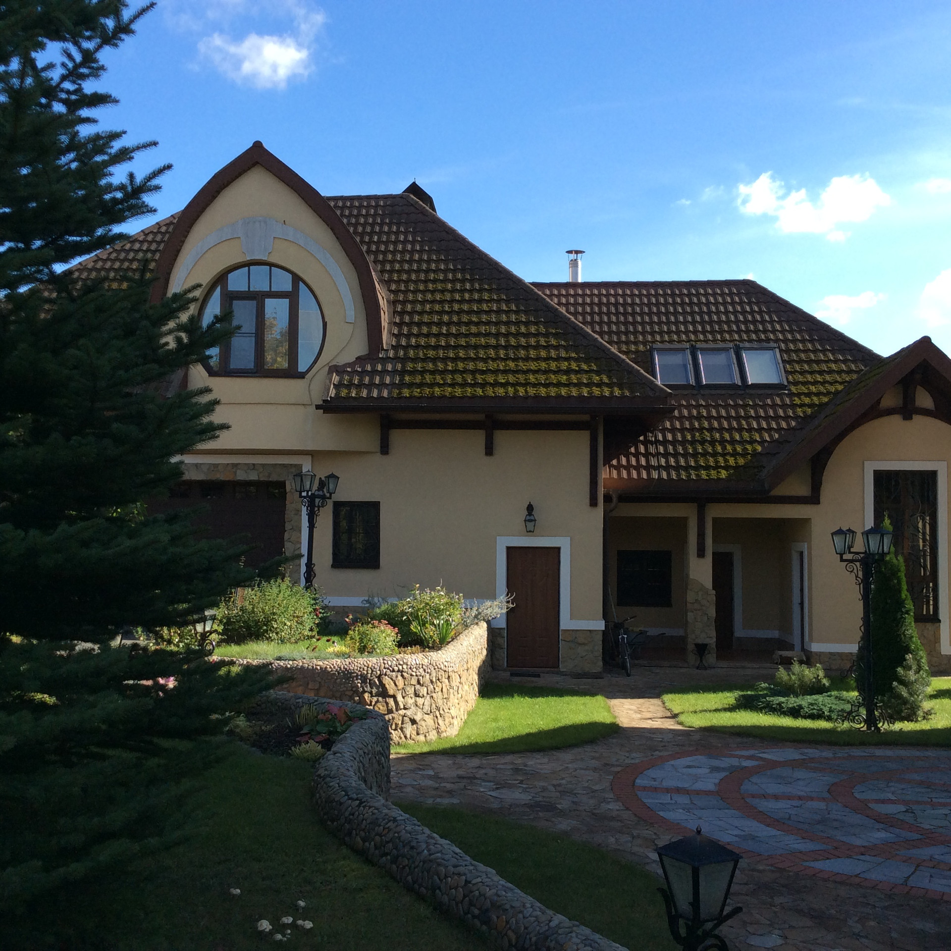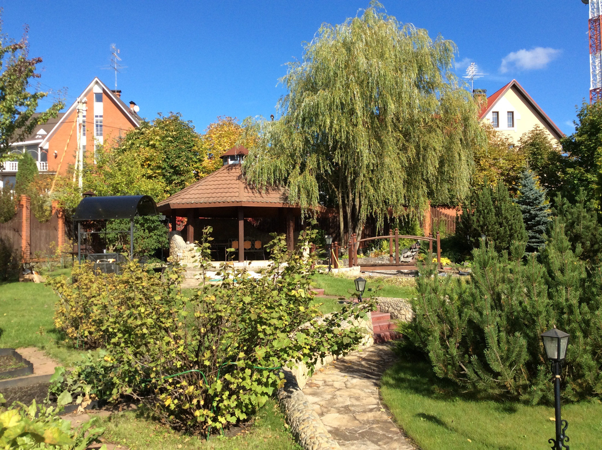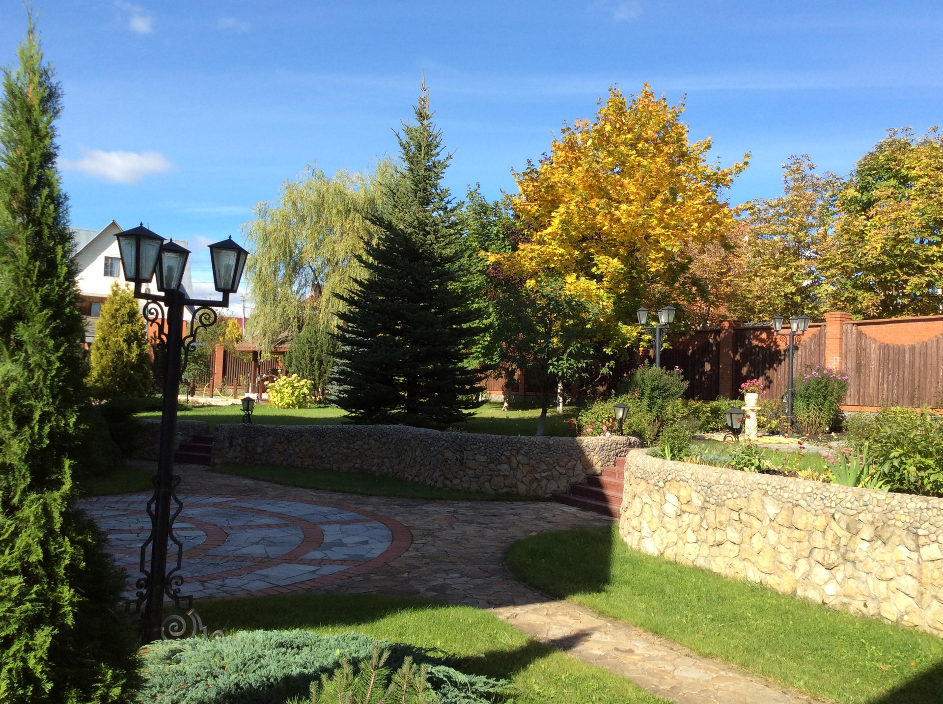 На участке ландшафтный дизайн, декоративный ПРУД с рыбами, прогулочные дорожки, альпийская горка, уличное освещение.