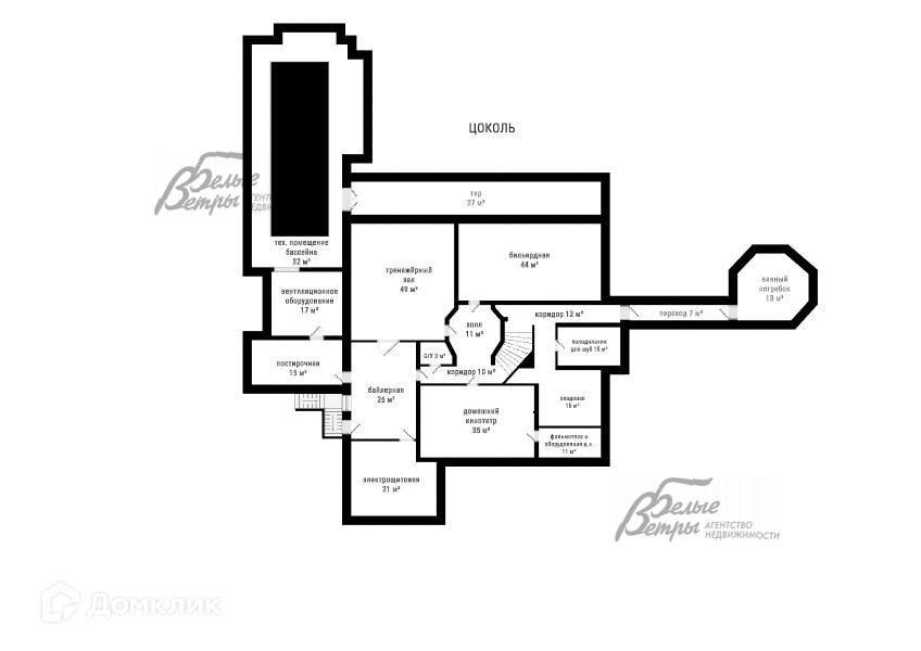 Цокольный этаж: Радиусная лестница спускается с первого этажа в круглый холл 11 кв.м с выходом в кинотеатр 46 кв.м (со своей комнатой 10.4 кв.м для хранения оборудования и материалов) и расположенным в непосредственной близости санузлом. Холодная кладовая 9.5 кв.м и кладовая 15.4 кв.м, бильярдная комната 44 кв.м и тренажерный зал 48 кв.м, коридор 12 кв.м (его можно использовать в том числе как тир) и переход 6.5 кв.м ведут в винный погребок 13.4 кв.м, в который также можно спуститься с 1 этажа по лестнице. Есть еще одна, винтовая лестница на 1 этаж, находящаяся рядом с комнатой 28 кв.м, предназначенной для размещения оборудования бассейна. Рядом расположены бойлерная 26 кв.м + электрощитовая 21 кв.м + комната вентиляционного оборудования 17.5 кв.м.