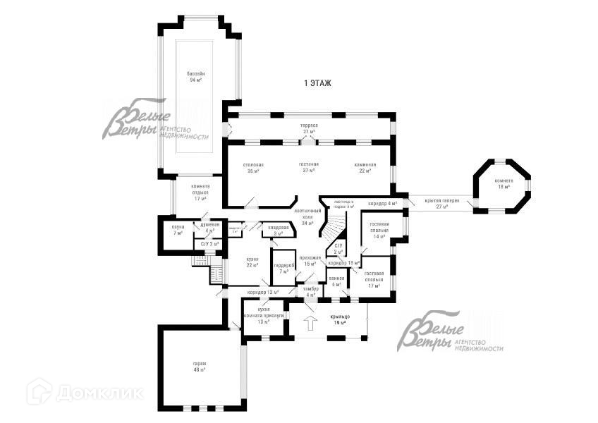 1-ый этаж: Большое крыльцо 19 кв.м ведет в прихожую 15 кв.м с тамбуром 3.7 кв.м и далее в центральный, круглый двусветный холл 24 кв.м с радиусной лестницей на другие этажи. Справа от парадного входа расположен гостевой блок из двух спален (16.5 кв.м со своей ванной комнатой 6 кв.м, а также спальня 14 кв.м, гостевой санузел и коридор 13.4 кв.м). Слева от входа находится гардеробная 7 кв.м и по коридору 11.8 кв.м мы попадаем сразу в две кухни: слева - для прислуги, 13 кв.м, справа - в просторную хозяйскую, 22 кв.м, с дополнительными выходами: в центральный холл и мимо двух кладовых 1.6 кв.м и 3.2 кв.м, в просторное помещение с огромными окнами и с выходом на крытую террасу 37.6 кв.м, предназначенное для столовой 26 кв.м, гостиной 37 кв.м и каминного зала 22 кв.м. В доме есть СПА-зона, состоящая из бассейна 94 кв.м (чаша 11х3м, глубина 2.5 м), комнаты отдыха перед бассейном 17 кв.м, сауны 7 кв.м с душевой и санузлом. Для развлечений имеется музыкальная комната 18 кв.м, расположенная отдельно от основного здания, с ведущей к ней крытой галереей 37.6 кв.м с коридором. Есть гараж на 2 автомобиля 48 кв.м, примыкающий к дому слева от парадного входа..