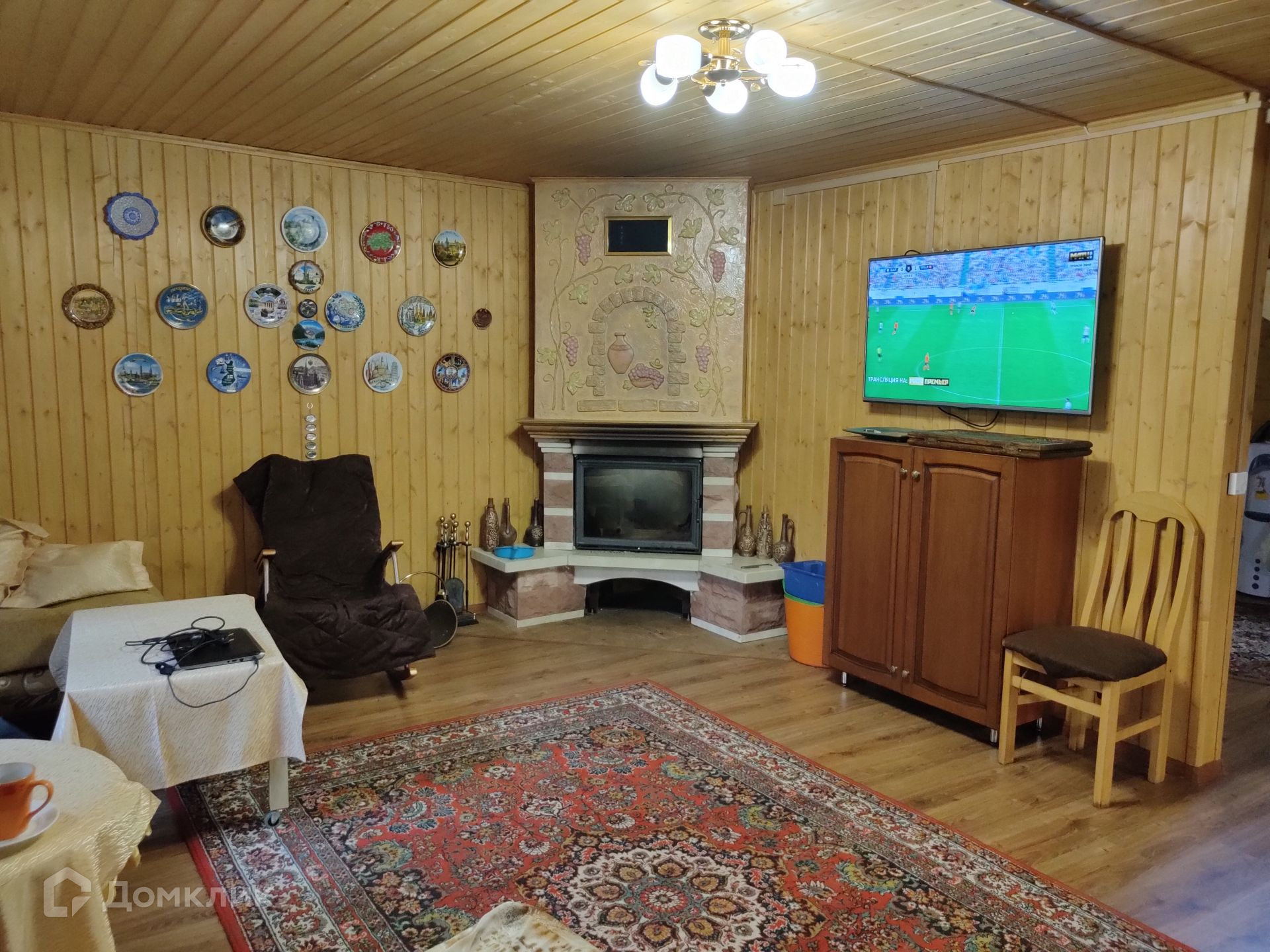 В гостиной сделан дизайнерский камин ручной работы. Создаёт очень атмосферное настроение.