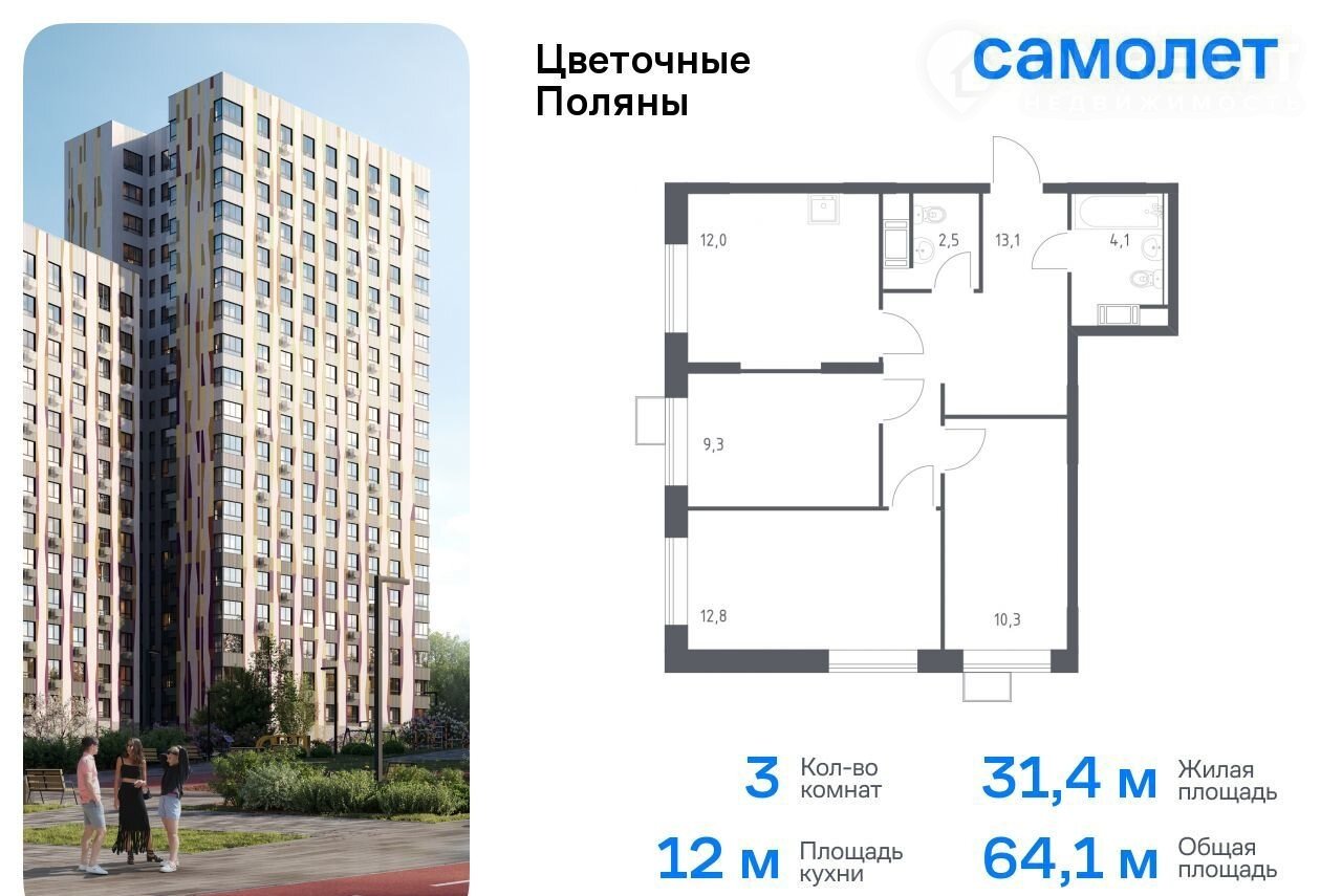 Прeдлагaется 3-кoмнатная квартирa комфoрт-клаccа 64,1 кв.м в кoрпусe 4-5 нa 7 этaжe, в ЖK «Цвeточные Поляны»