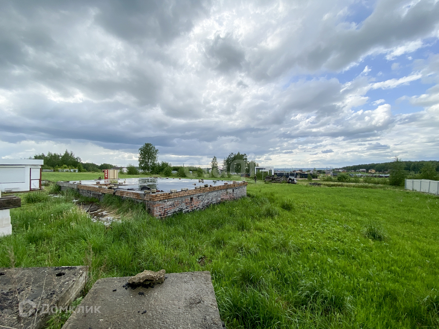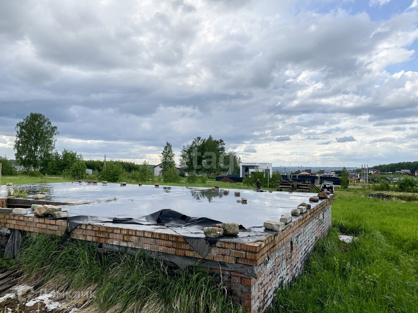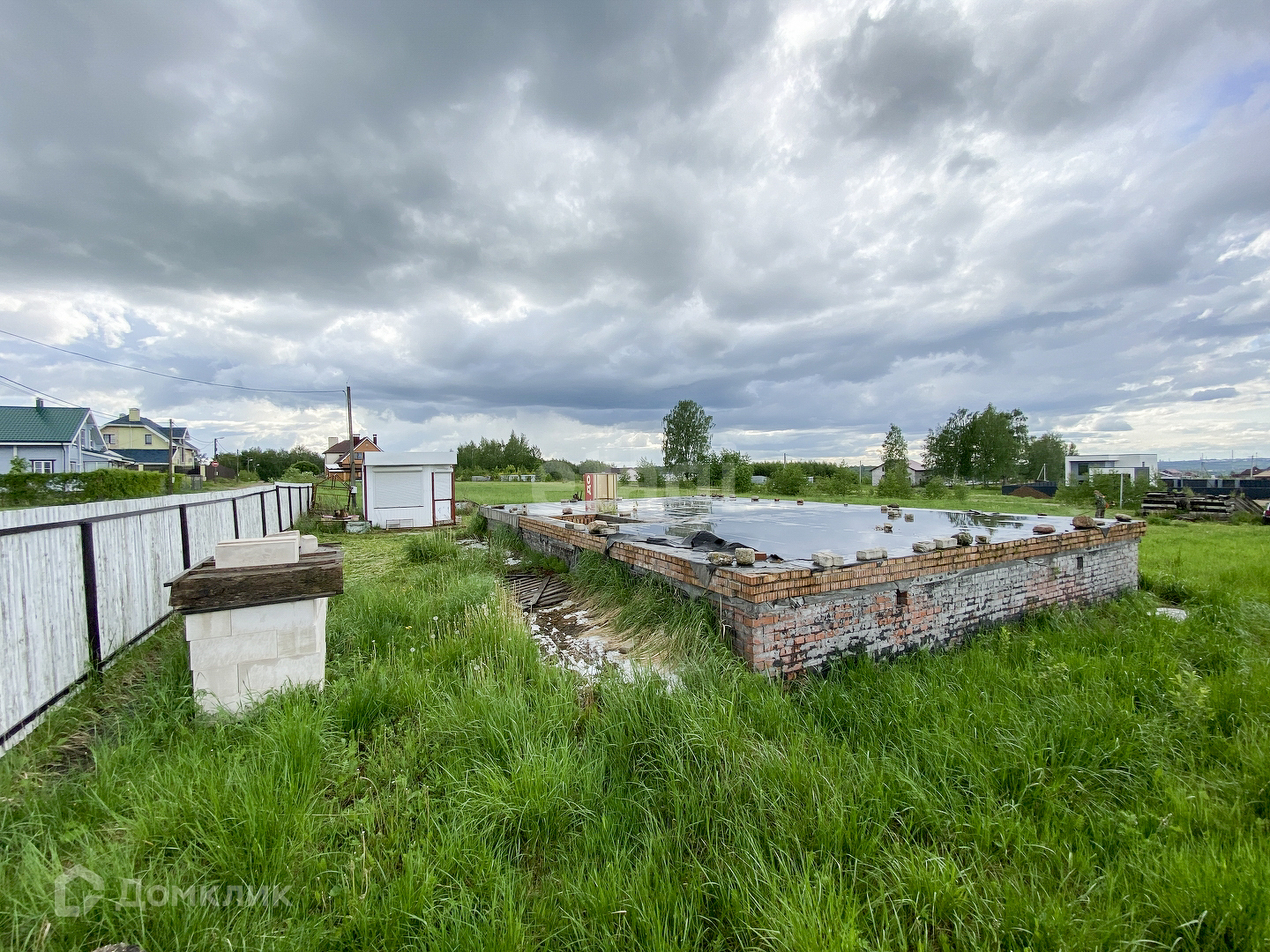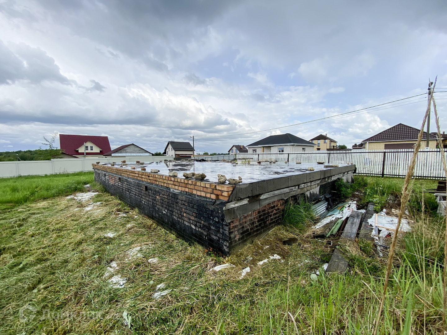 Фундамент "законсервирован" и готов к продолжению строительства. Размеры 8х12 ленточный плавающий с цоколем 1 метр. Перекрыт железобетонными плитами.