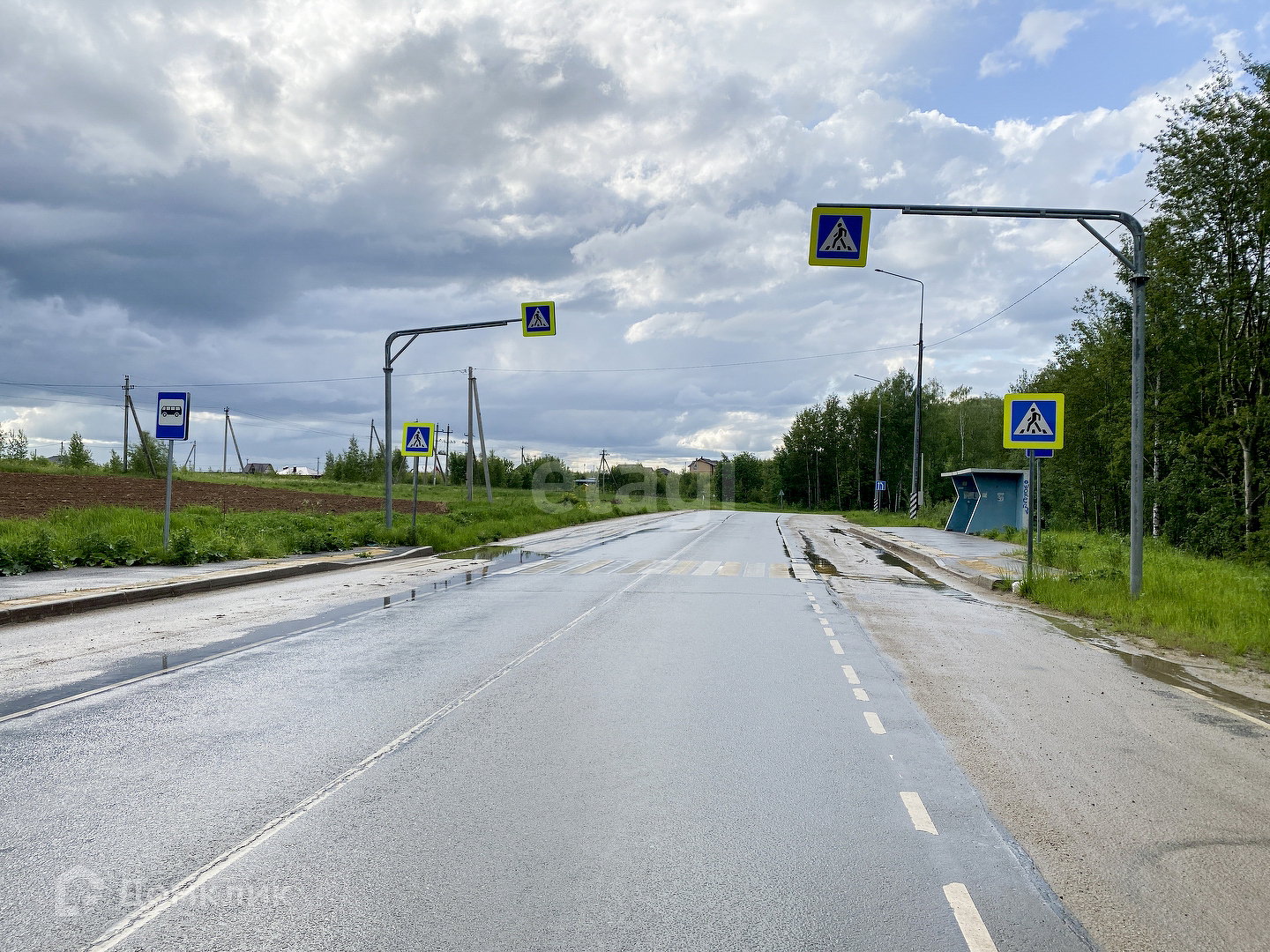 Улица жилая и застроена домами. Въезд на территорию через шлагбаум.