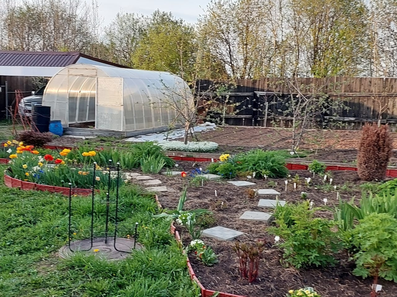 Насаждения: смородина, крыжовник, жимолость, голубика, виноград, ежевика, клубника, земляника, шесть яблонь. Две теплицы 3*6 поликарбонат