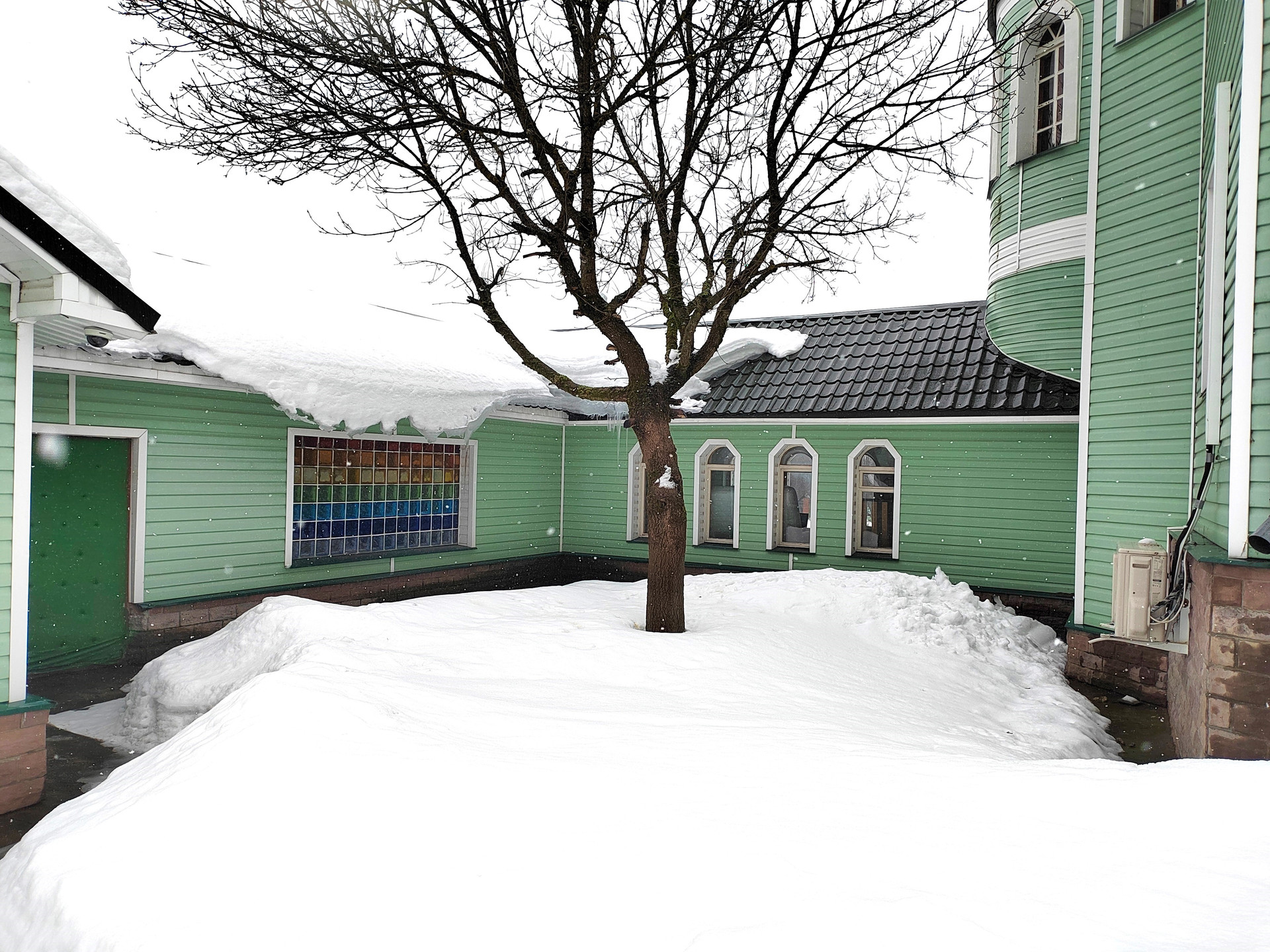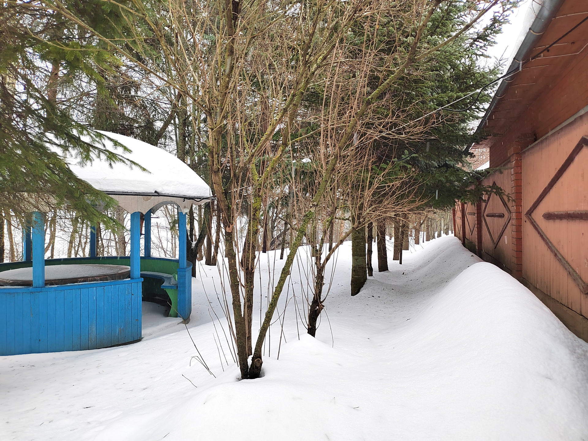 Из жилой части, через крытую галерею, проход в банно-спортивный комплекс: спортзал с тренажерами, бассейн, душевая, парная.