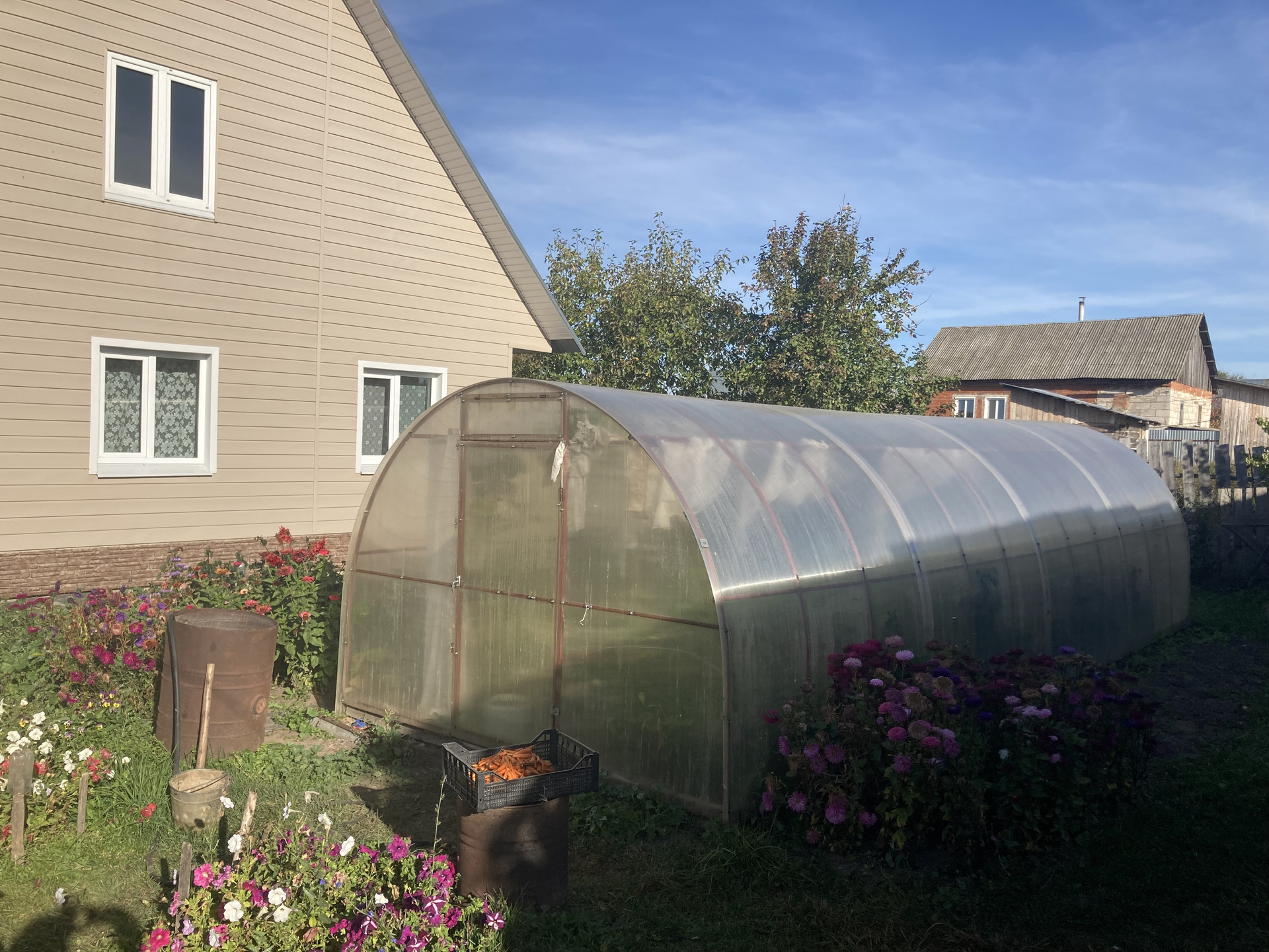 Посадки на участке — это настоящий рай для садоводов. Здесь есть плодово-ягодные деревья и кустарники, созданы грядки для овощей и зелени, разбиты небольшие клумбы для цветов. А достаточно большие теплицы помогают выращивать огурцы, помидоры и перцы с самой ранней весны.