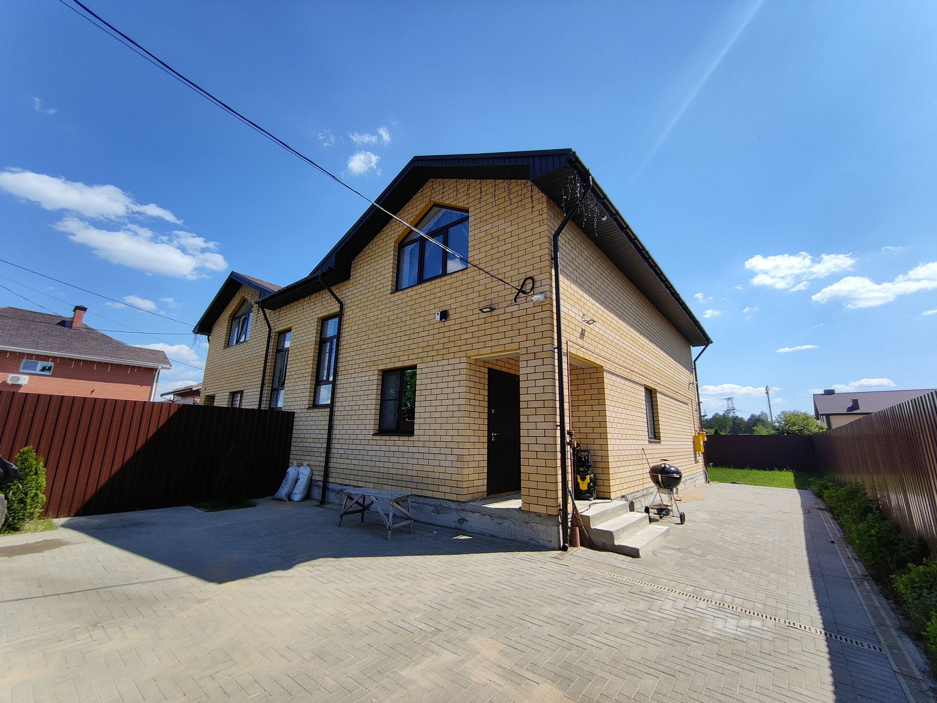 Дом построен из газосиликатных блоков, облицован керамическим кирпичом.
