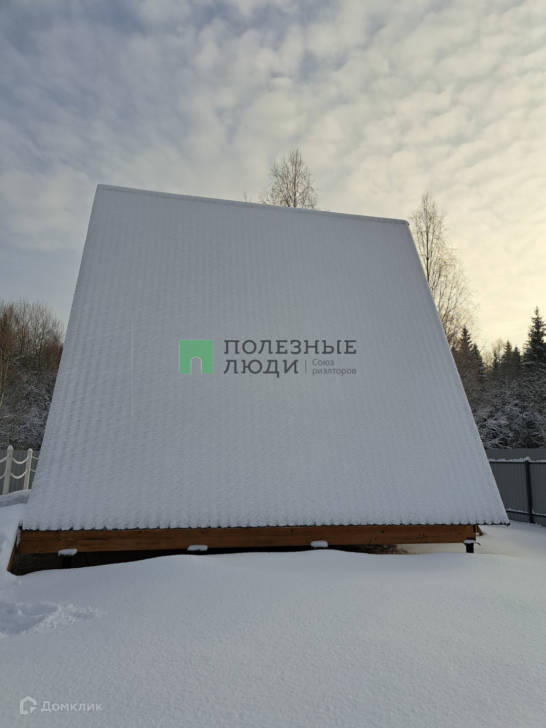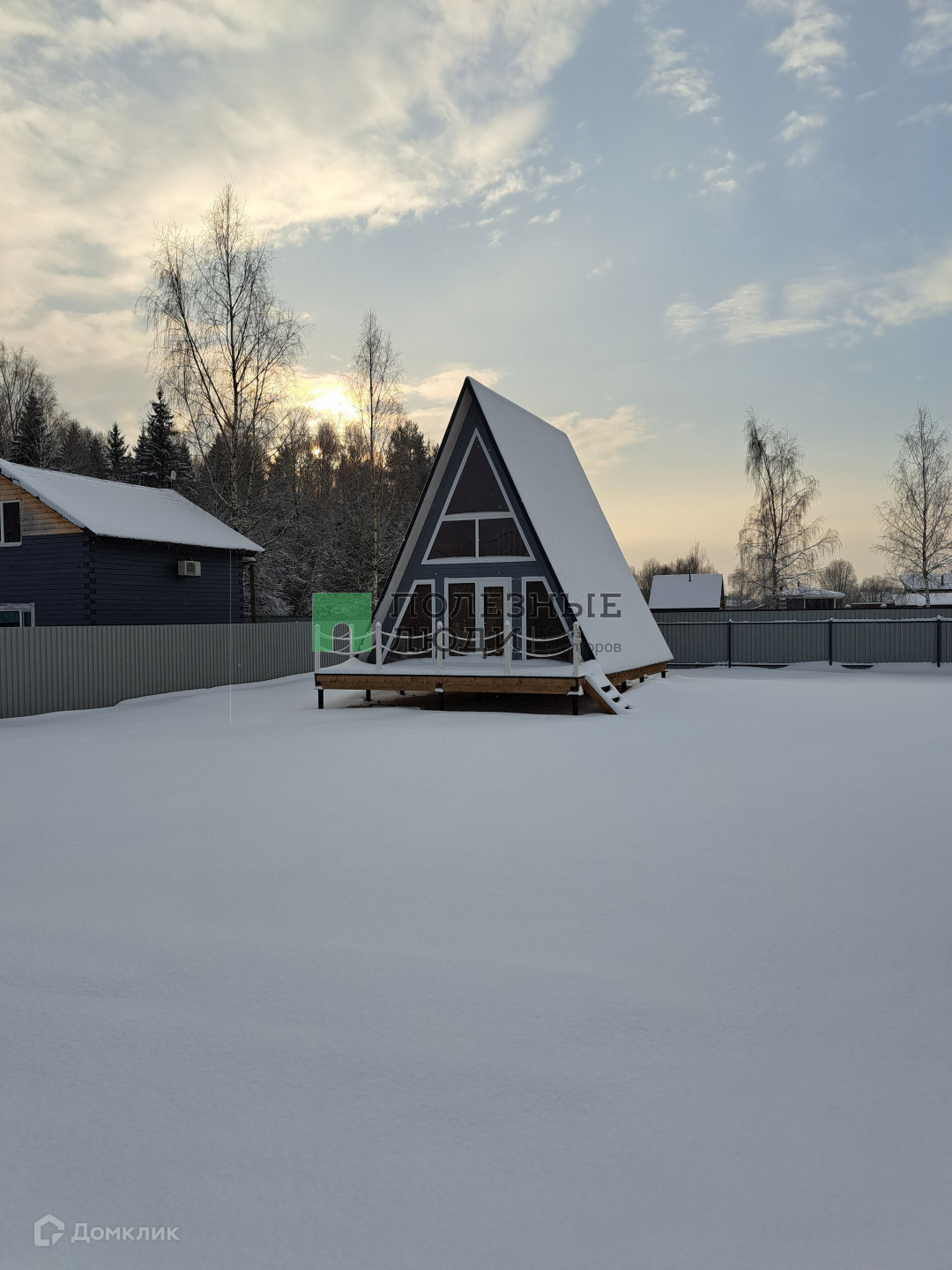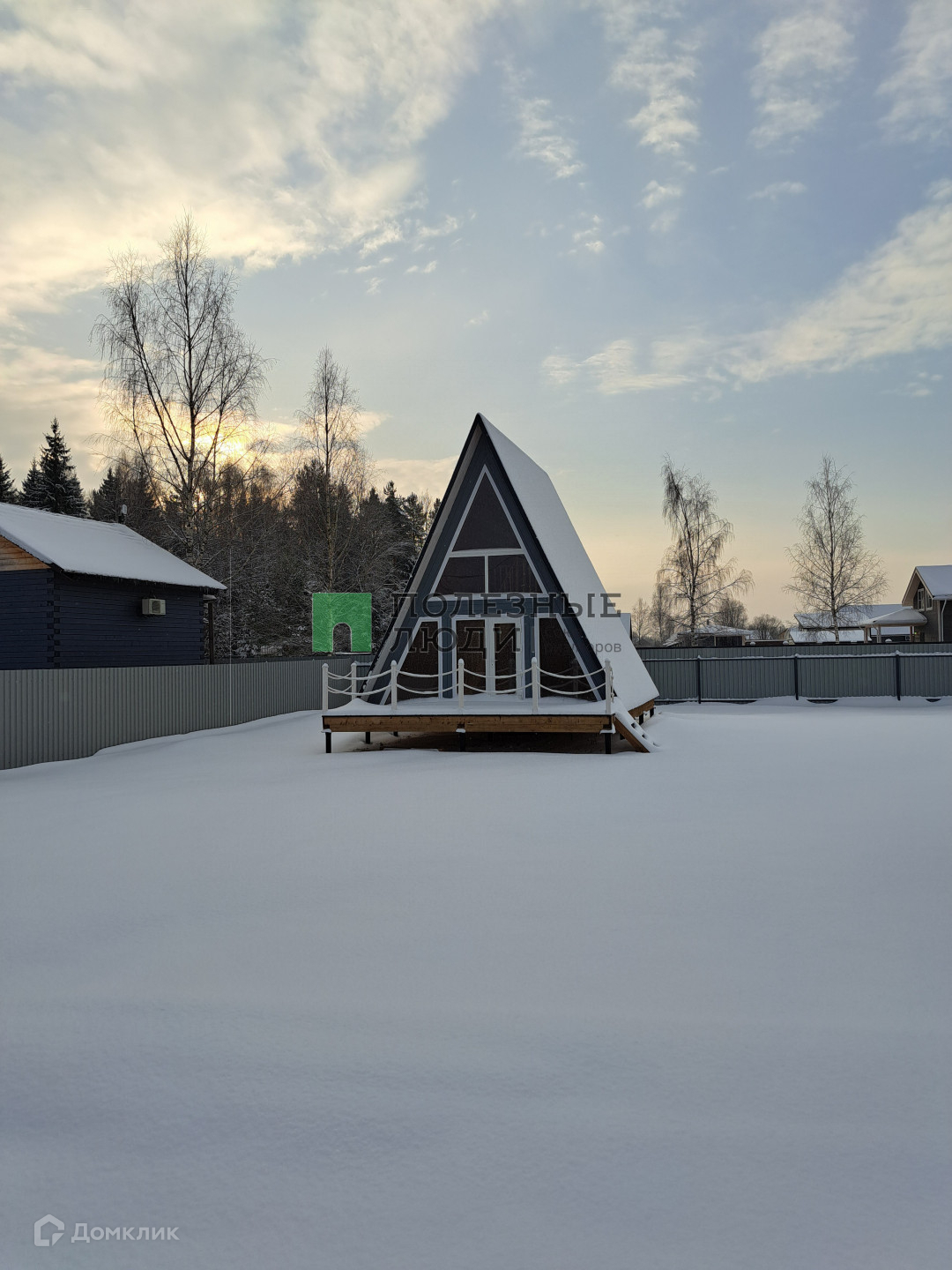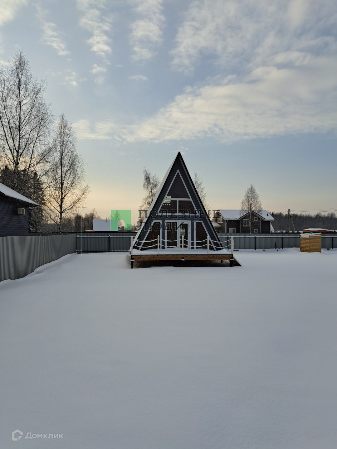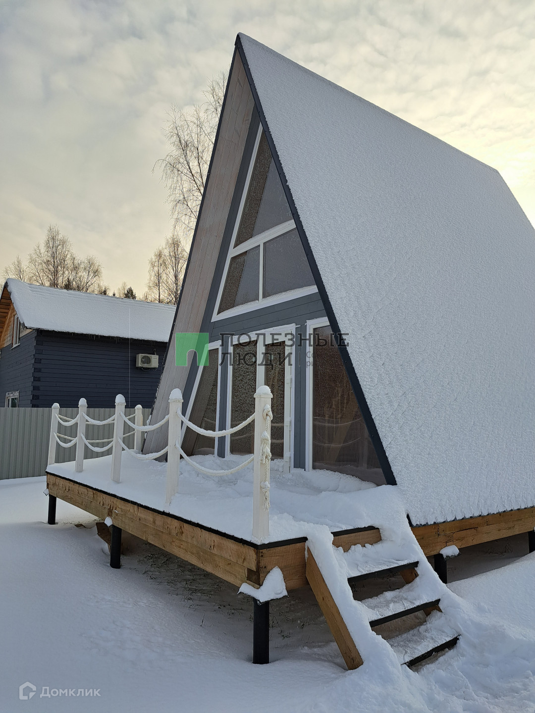 Есть терасса и весь дом стоит на металлических сваях. Дом треугольной формы крыша идет от пола, покрыта металочерепицей, грязь и снег не будут налипать. Толщина утеплителя крыши 150 мм, утеплителя пола 200 мм. Собирала бригада профессионалов!