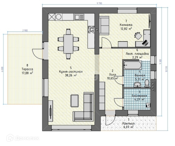 На первом этаже большая кухня-гостиная с двойным светом -38,26 кв/м, спальная комната-12,82 кв/м, отдельная комната под бойлерную, терраса-17,88 кв/м, санузел