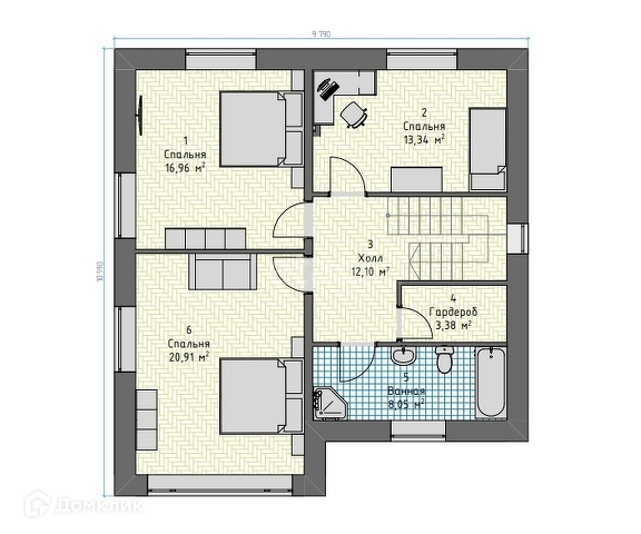 На втором этаже-три спальни, холл-12,10 кв/м, санузел и гардеробная.