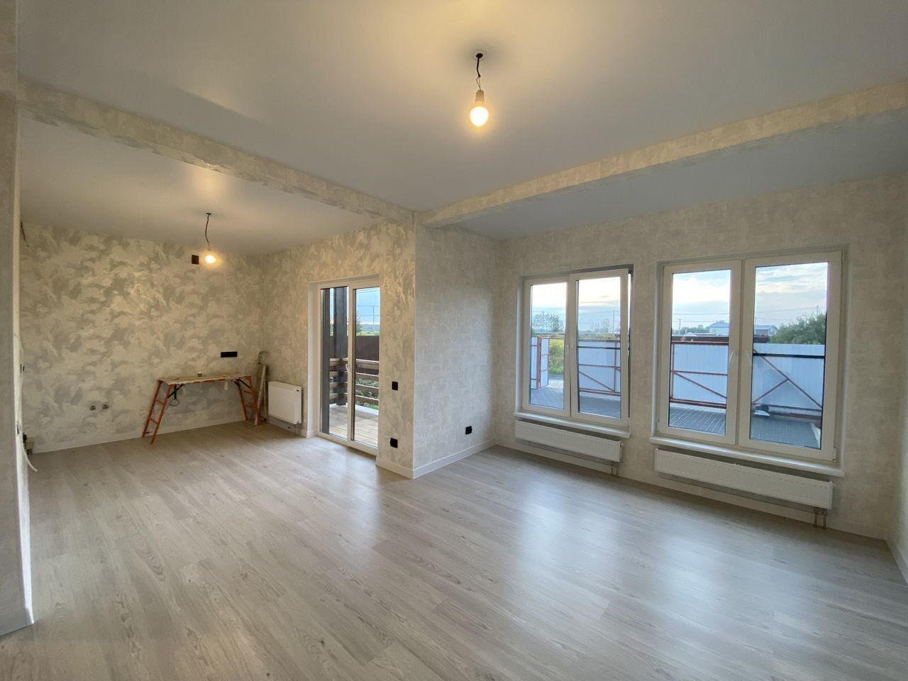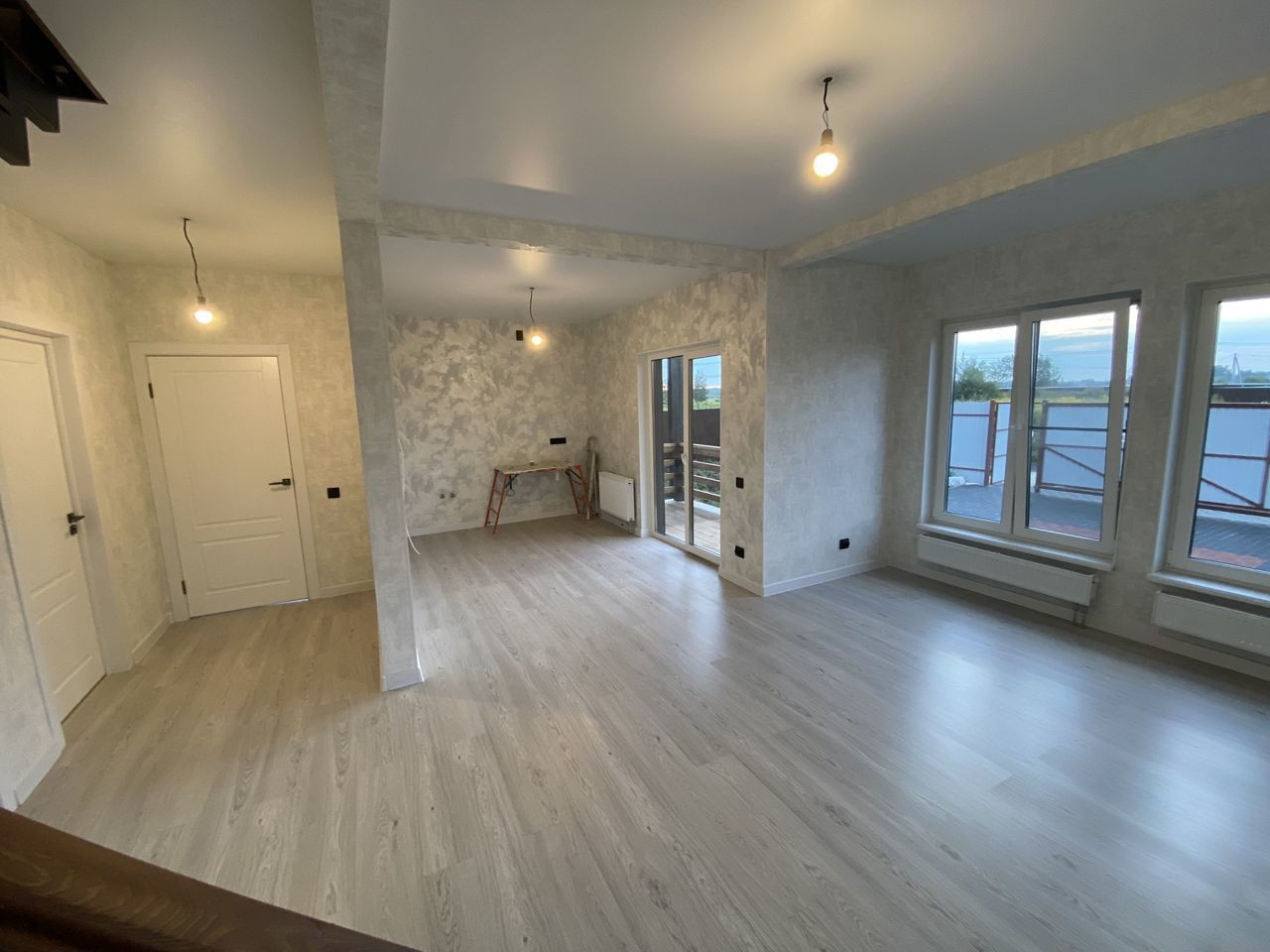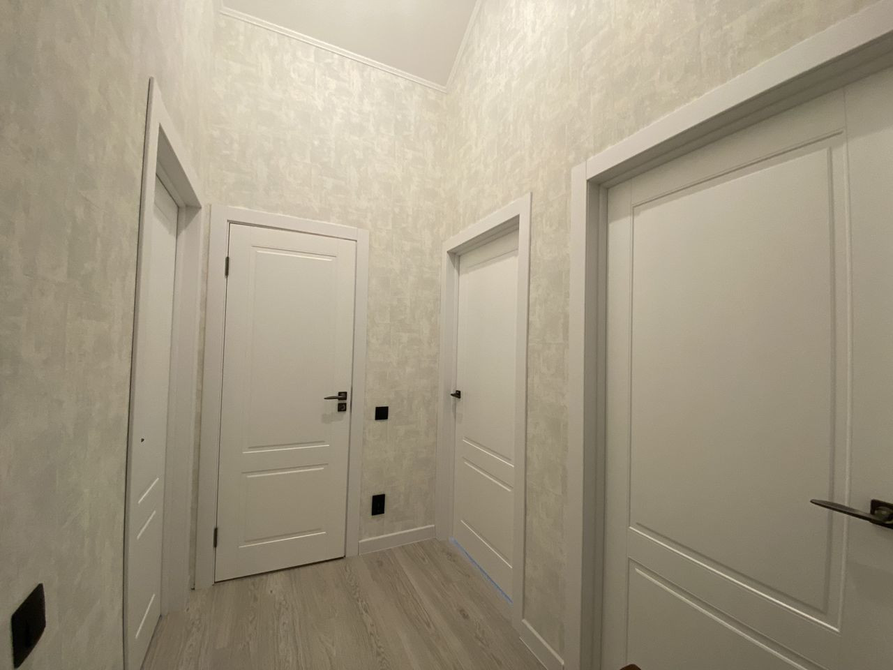 Белые стены, ламинат 33 класса, керамогранит в санузлах, добротные межкомнатные двери, натяжные потолки.