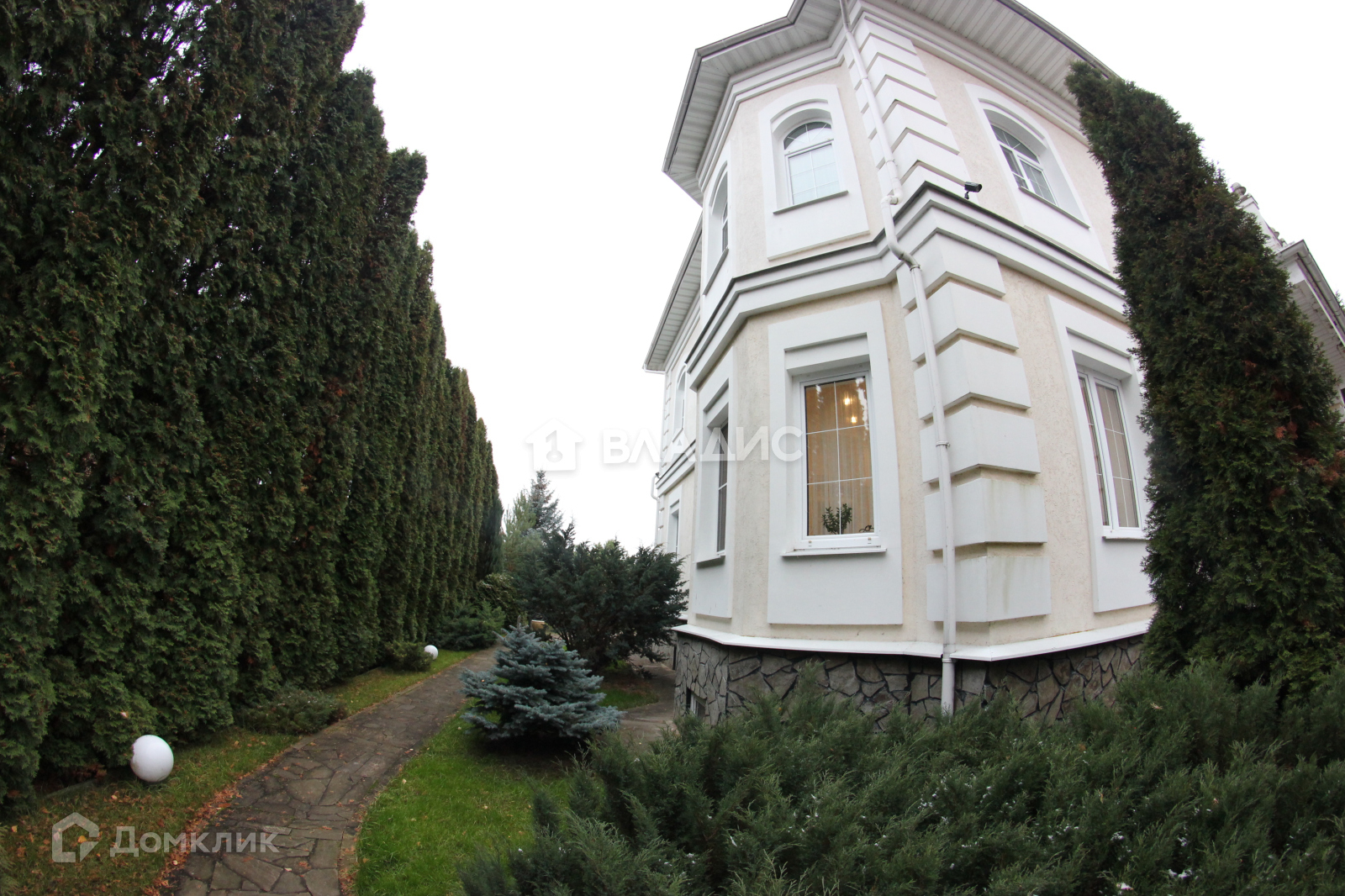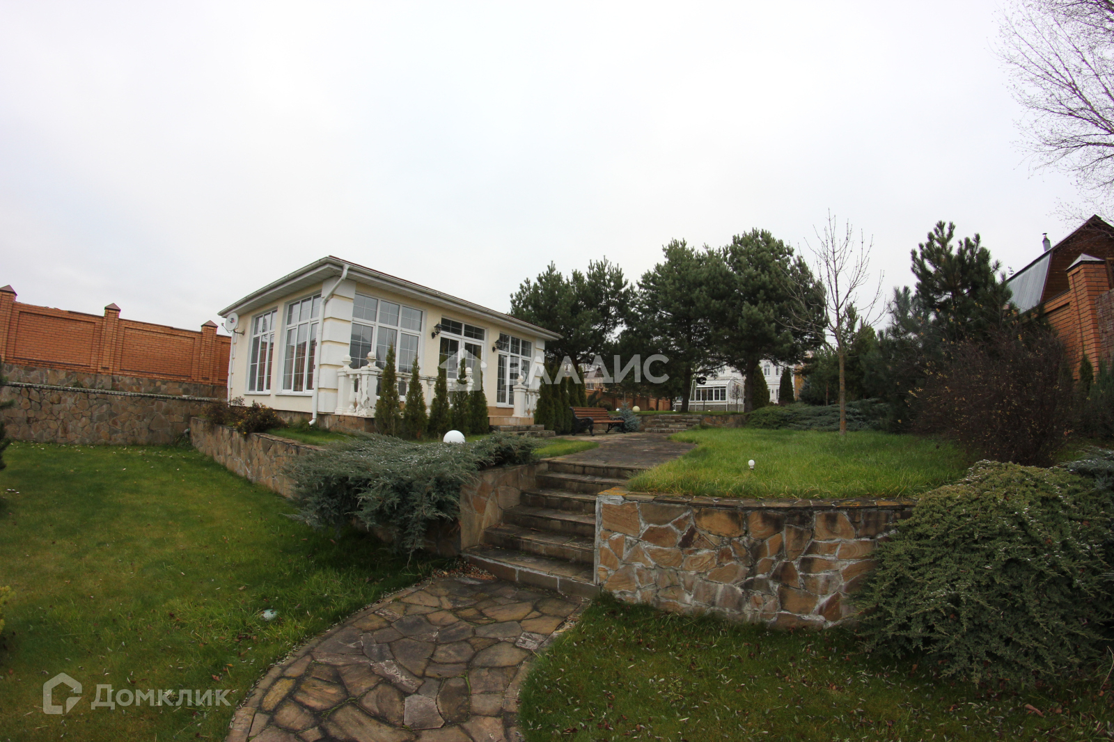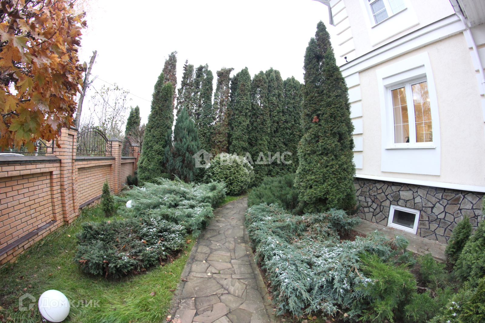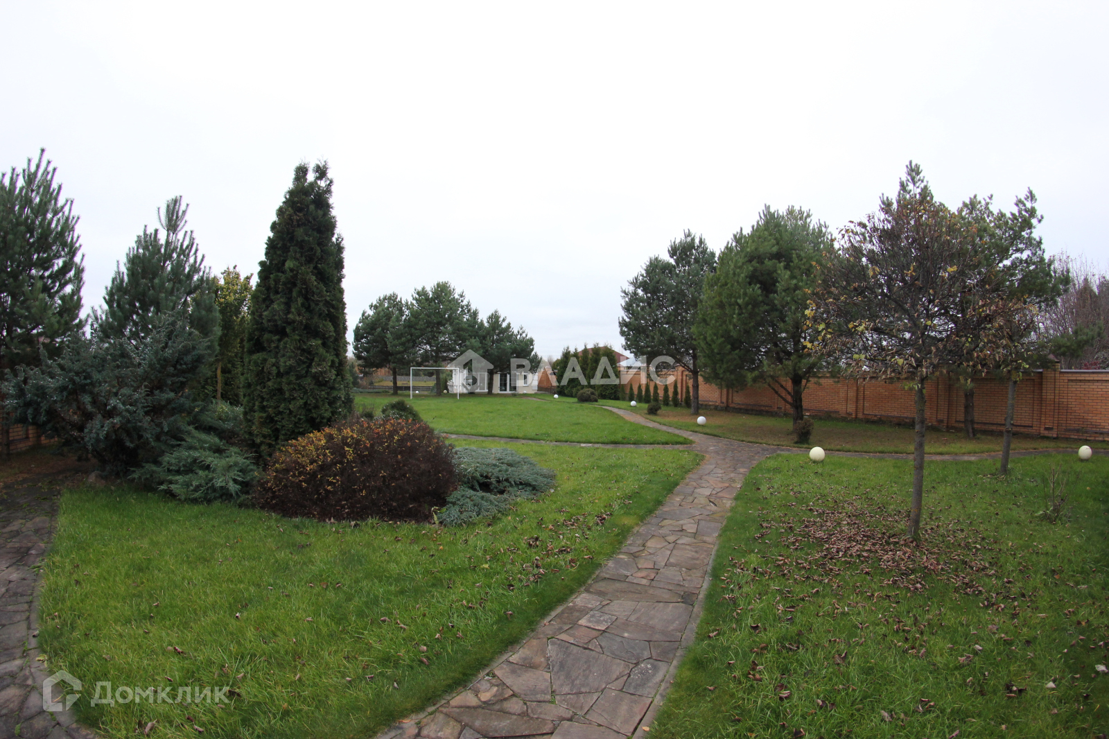 На участке множество туй, елей, пихт, газон, выложены дорожки их камня и брусчатки.