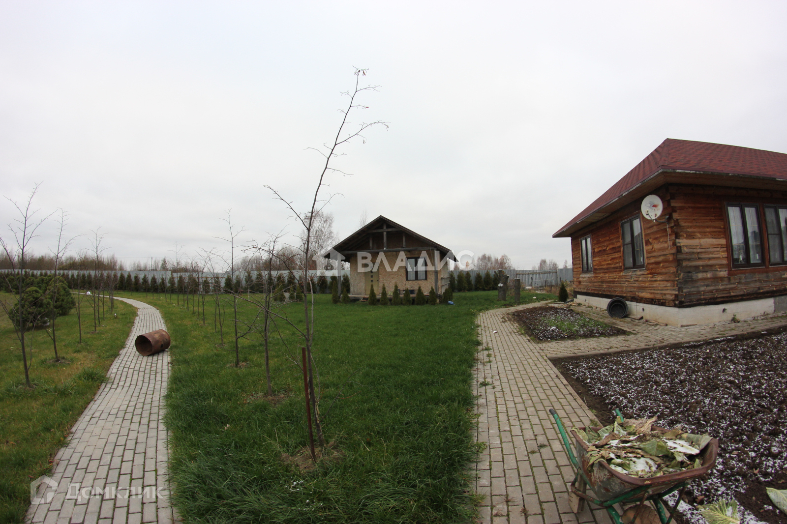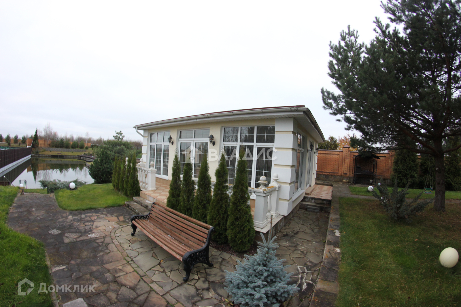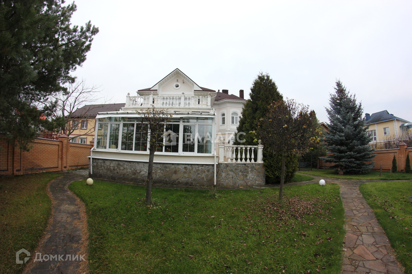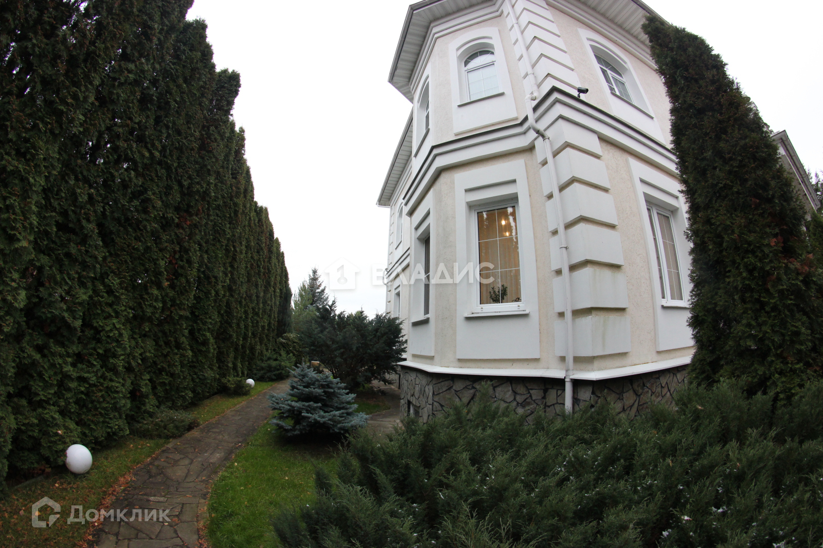 На участке множество туй, елей, пихт, газон, выложены дорожки их камня и брусчатки.