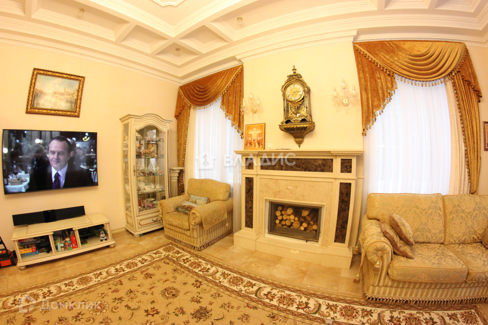 - гостинная с камином из мрамора и мебелью.