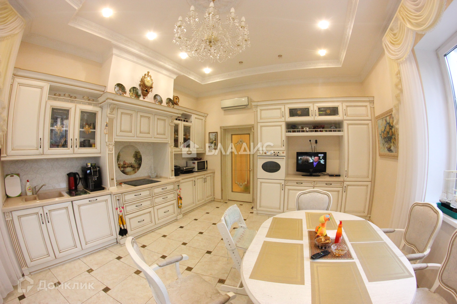 - кухня, беленый массив дуба с техникой(посудомойка, варочная панель, духовой шкаф, холодильник,кофемашина) стол и 6 стульев.