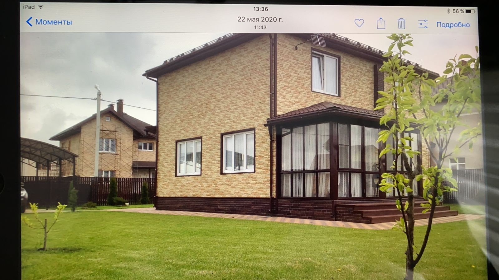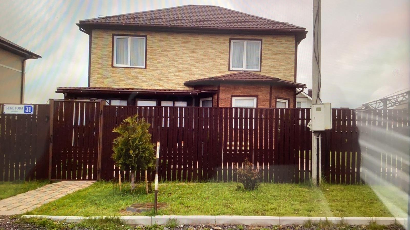 Дом 165 метров по каталогу европейских  проектов домов, на участке 8 соток, технология - канадский эко-дом, фундамент сваи, стены сип-панели, крыша металлочерепица, отделка дома американский найлайт. Окна пластик. 1 этаж - кухня-гостиная 38 метров с мебелью, материал дуб, цвет ваниль, комплект стол 240 см и 6 стульев Индонезия, комод под тв красное дерево, кабинет, холл, бойлерная, санузел, две веранды по 12 метров остеклены. Второй этаж - 3 спальни, холл, санузел. Участок с ландшафтным дизайном из хвойных пород (более 30 хвойников) плюс плодовые деревья и декоративные кустарники из питомников. Тротуарная плитка - от входной группы, вокруг дома и под навесов для двух машин (размер 6 на 6 метров. Беседка деревянная 3 на 4 метра. Вспомогательное помещение под крышей 30 метров для мотоцикла, велосипедов, техники, колёс для машины и тд. Ворота въездные автоматические.