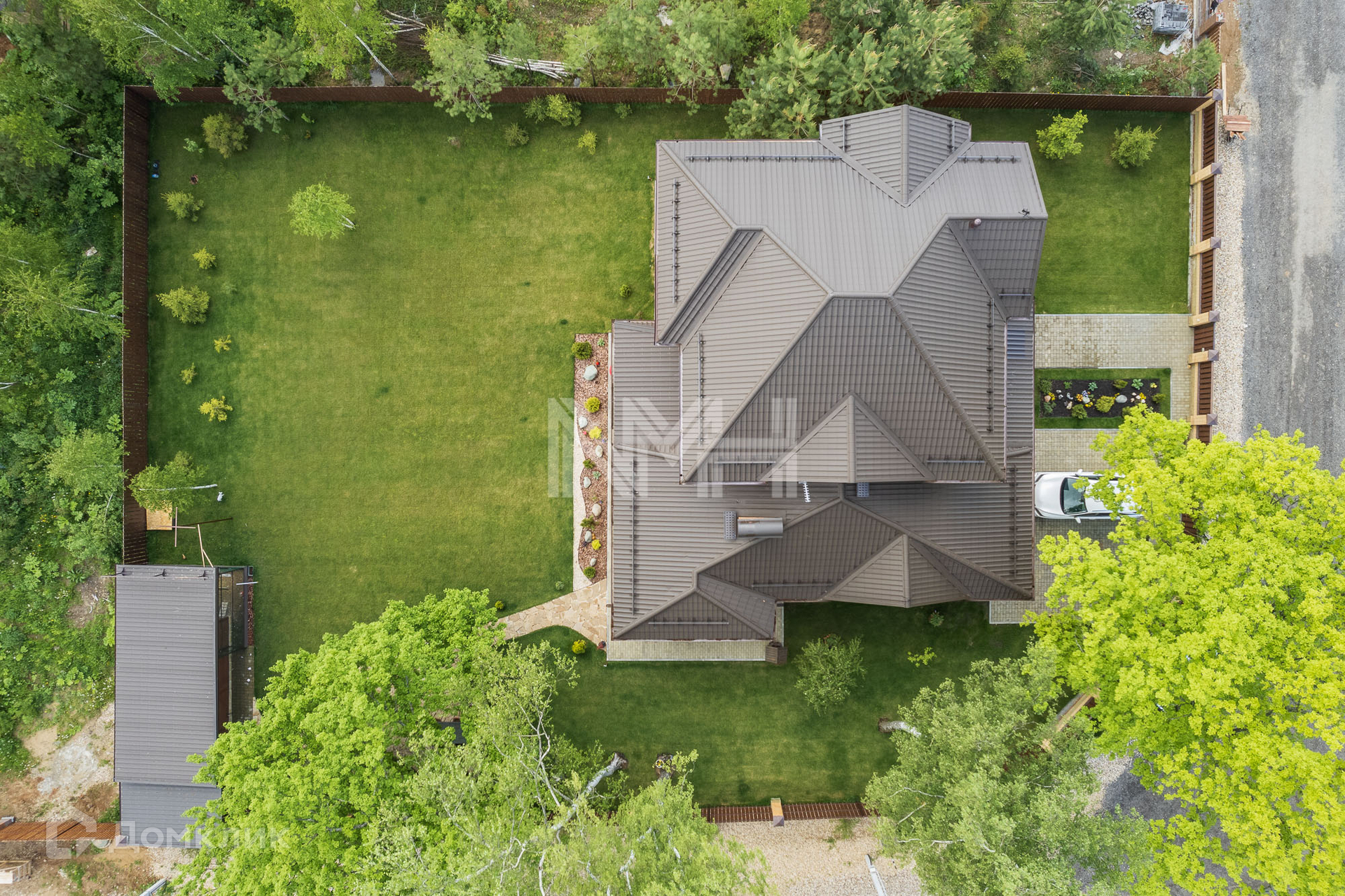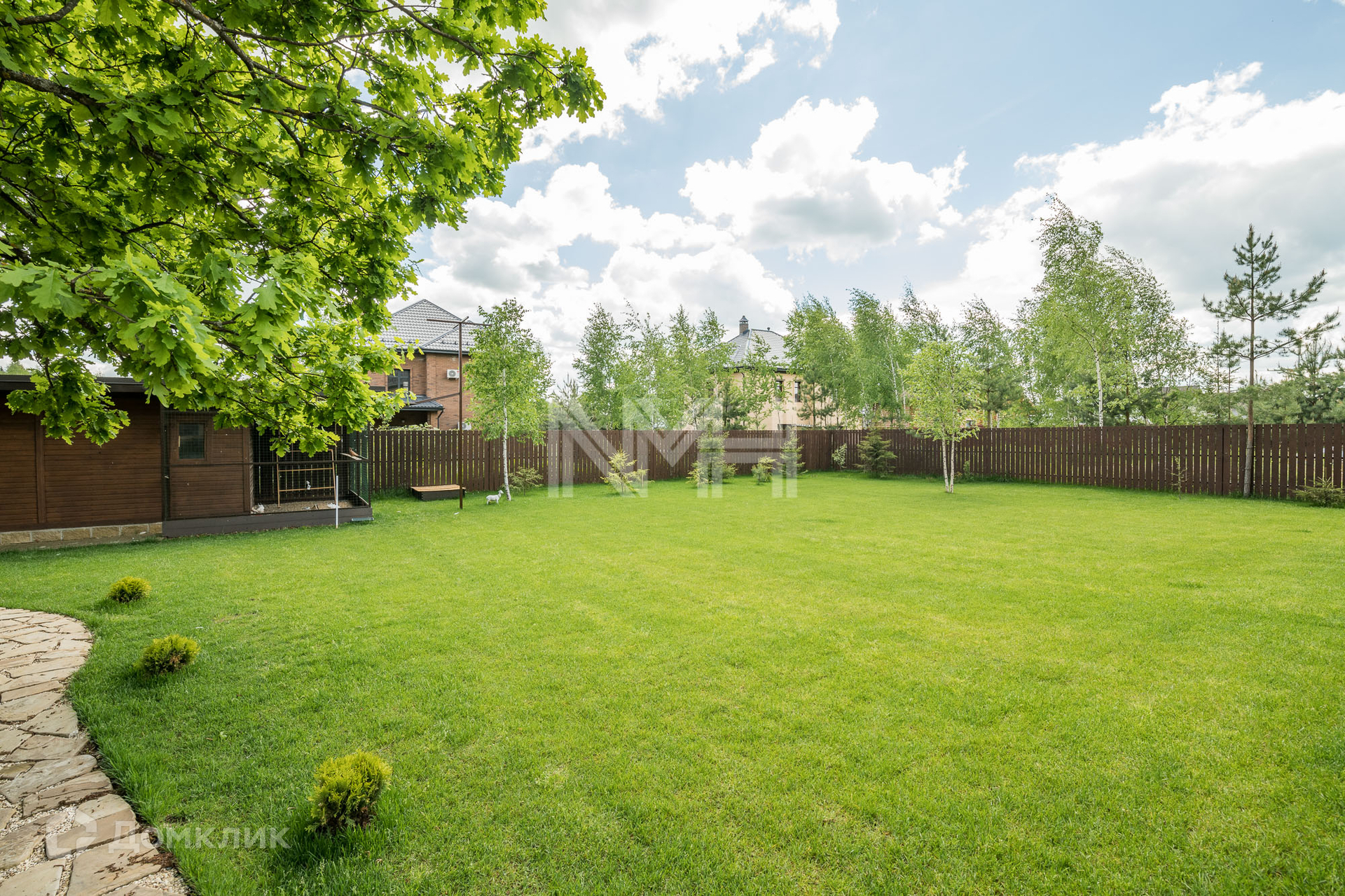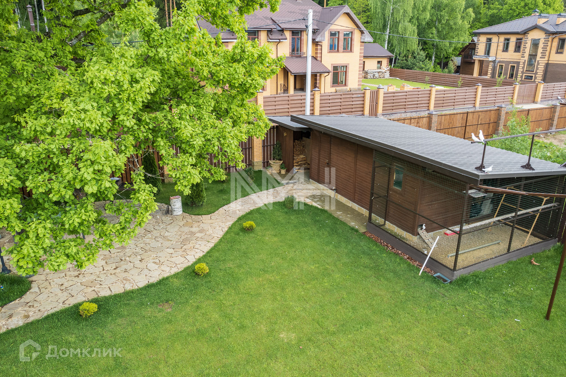 Участок 12,4 соток огорожен кирпичным забором с коваными элементами. На участке разбит газон, организованы клумбы с цветами, вымощены дорожки. В углу участка расположено хозяйственное помещение и голубятня.