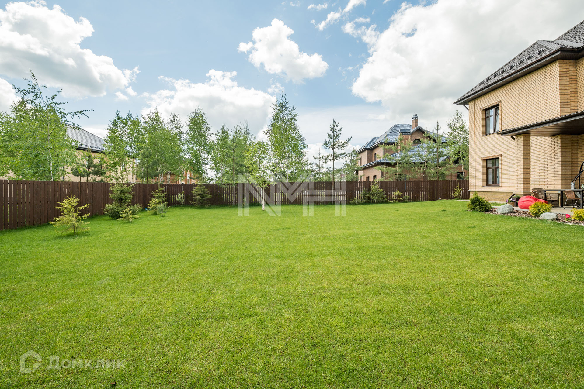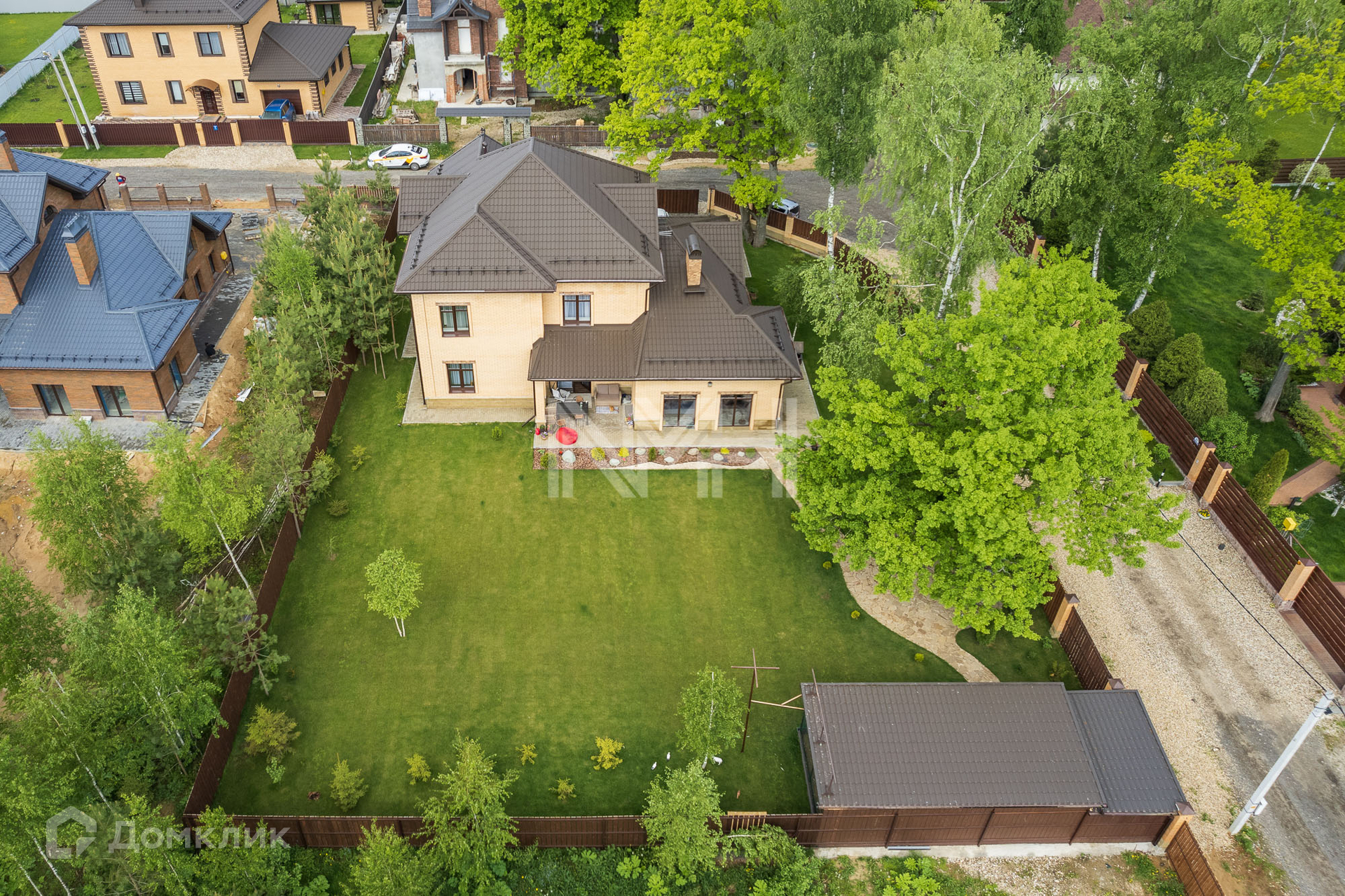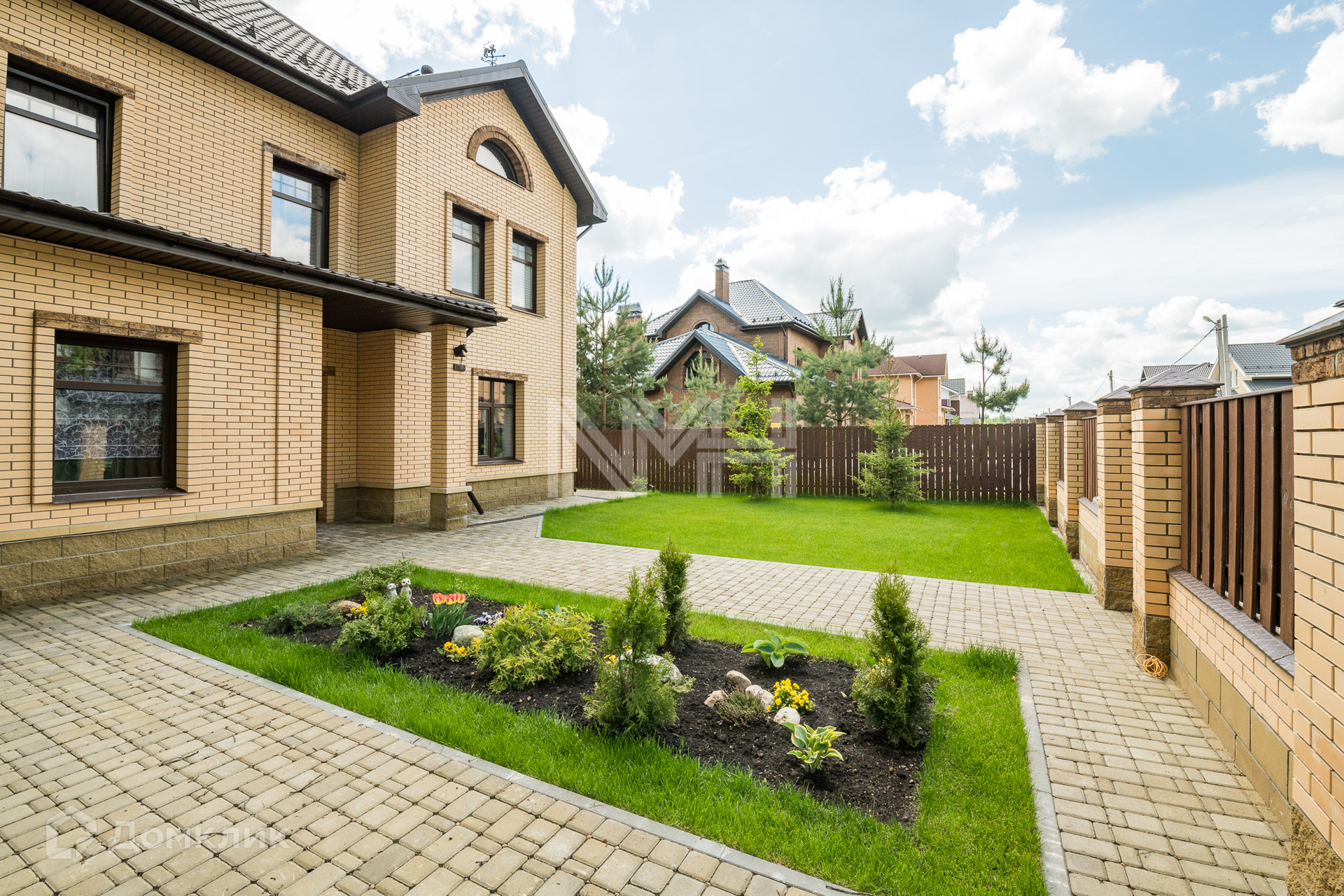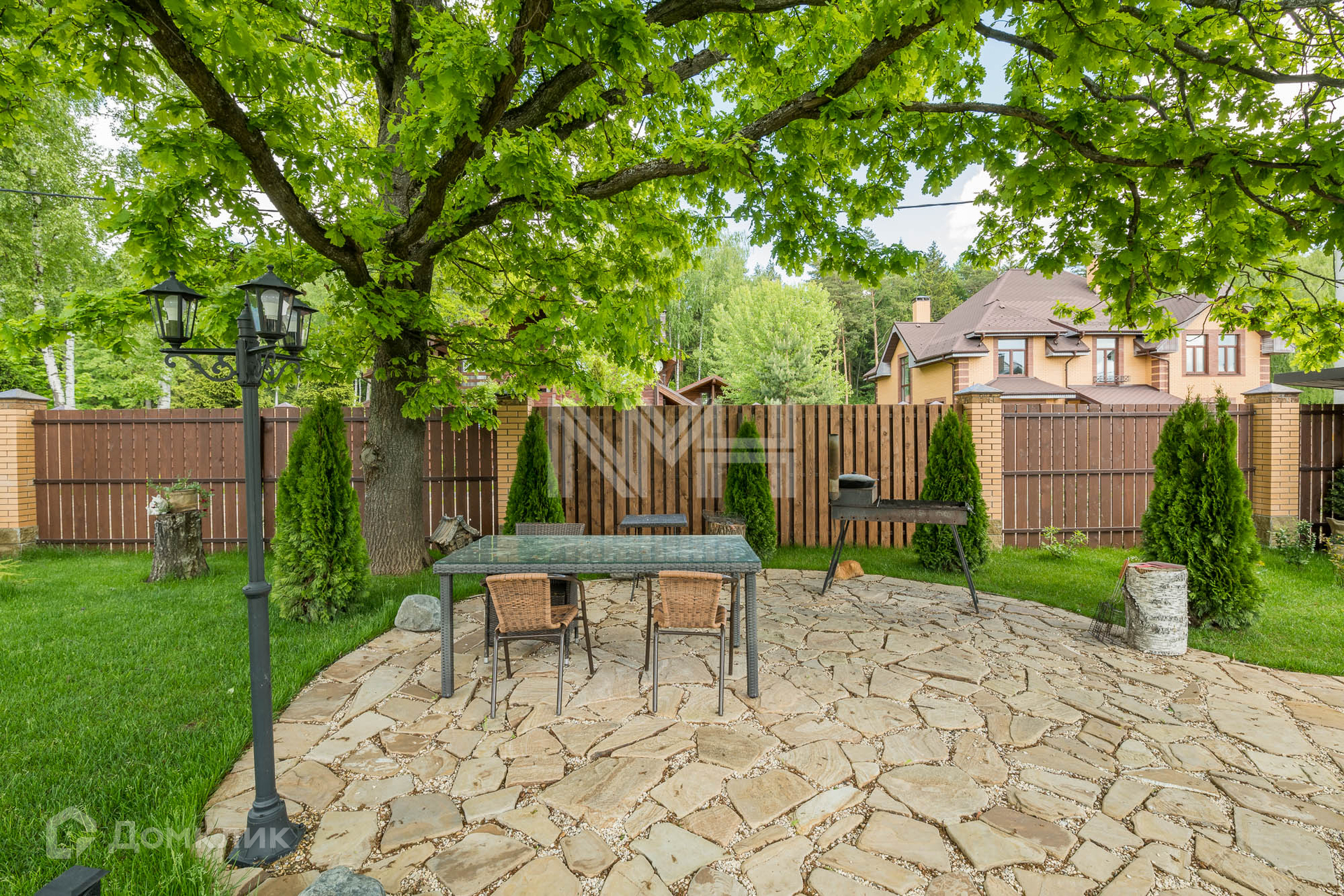 Участок 12,4 соток огорожен кирпичным забором с коваными элементами. На участке разбит газон, организованы клумбы с цветами, вымощены дорожки. В углу участка расположено хозяйственное помещение и голубятня.