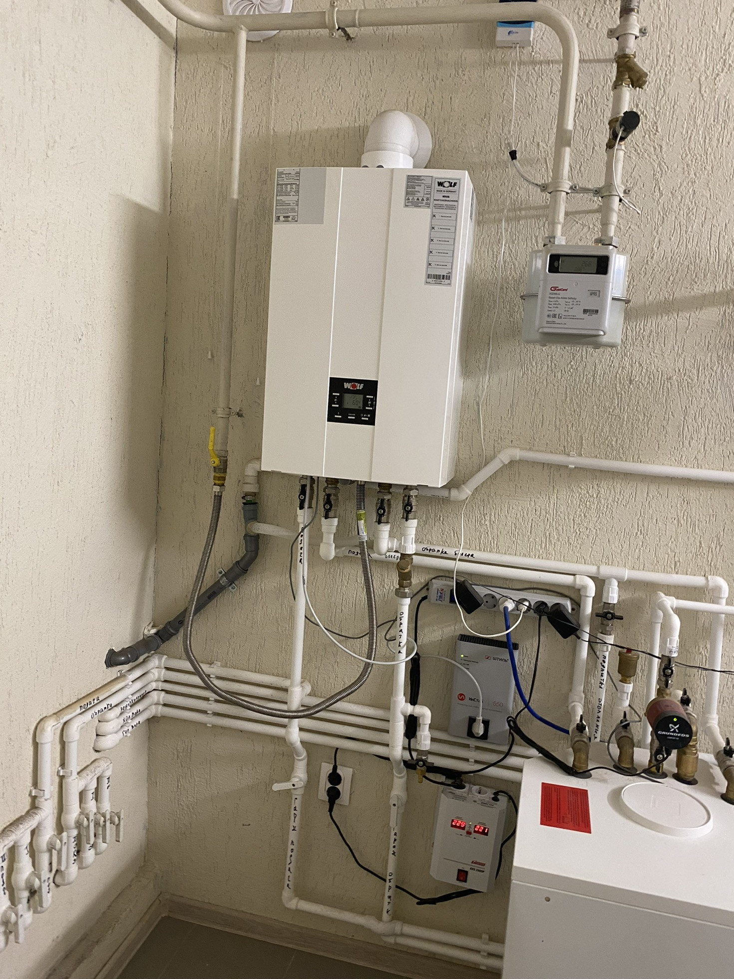 Вода - скважина с американской системой очистки воды. Канализация септик, отопление немецкий газовый котёл + бойлер (газ магистральный проведён в дом).