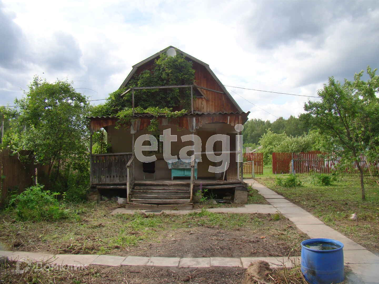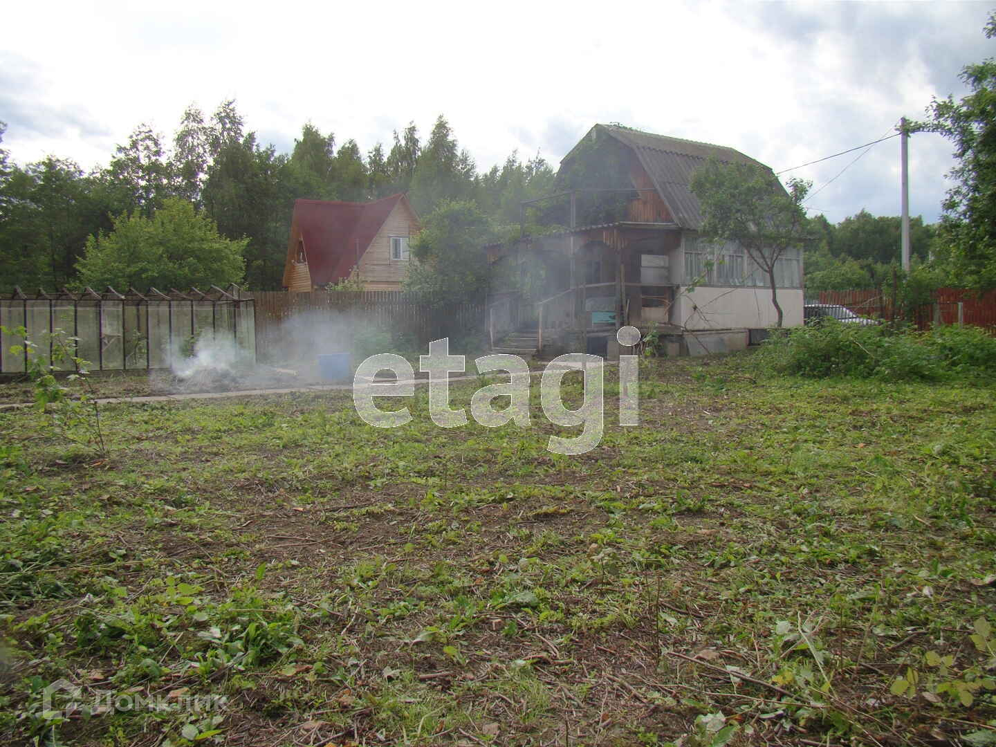 На земельном участке 7,7 соток расположен дом 50м2 из бруса, обшитый щитами, фундамент - сваи. Мансардный этаж, крыша покрыта шифером.