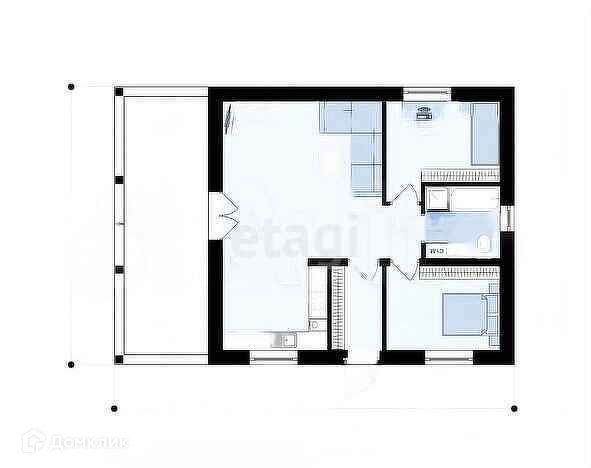 Планировка внутри: 2 жилые комнаты порядка 14м2, кухня-гостиная 32,1м2 с выходом на боковую часть участка, просторная ванная комната 5,5 м2, холл 8м2.