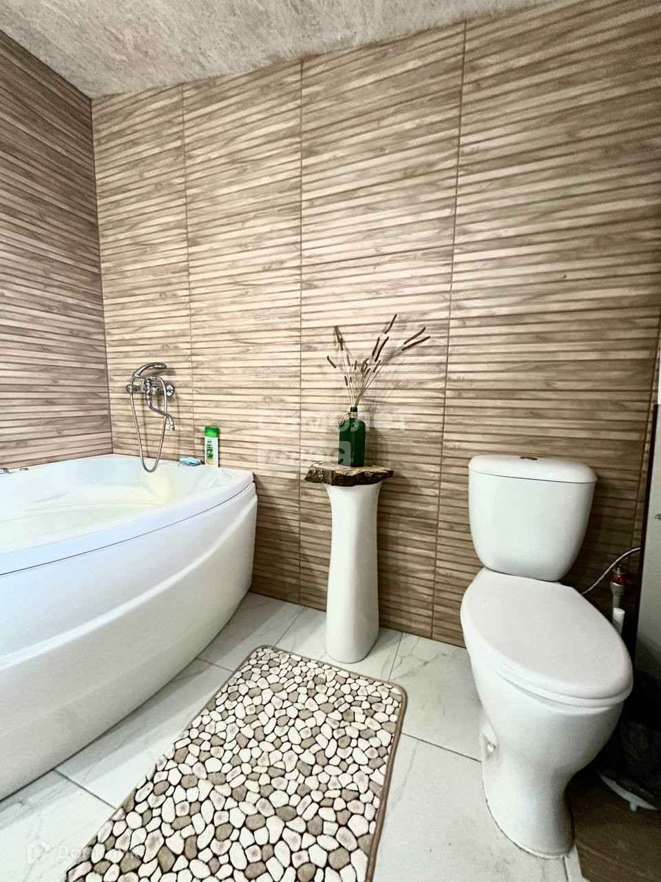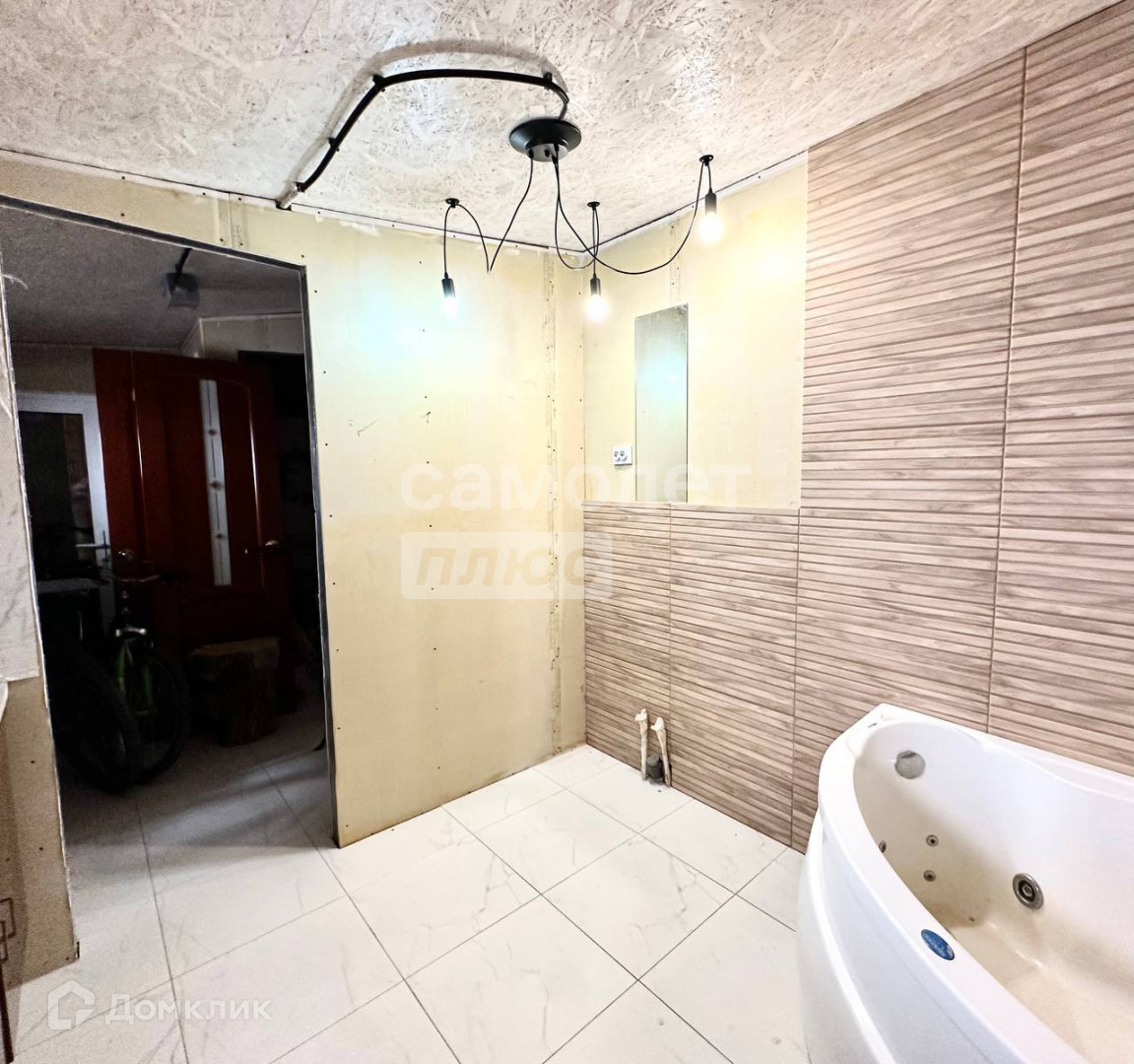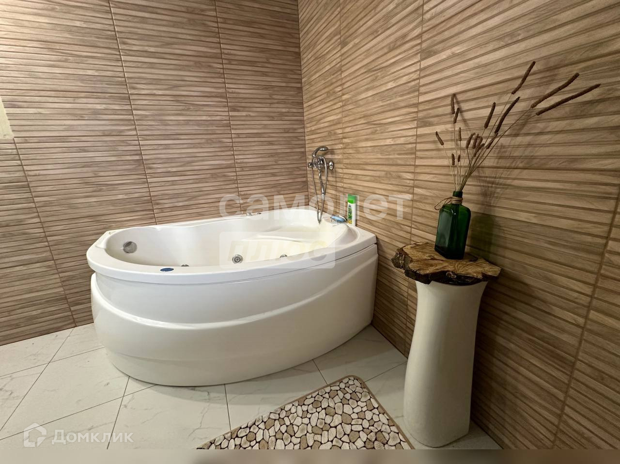 4. В большой ванной комнате теплый пол, батареи, современный кафель. Установлены джакузи, унитаз, смеситель, душ, куплена но ещё не установлена раковина, есть выводы для стиральной машины и гигиенического душа;