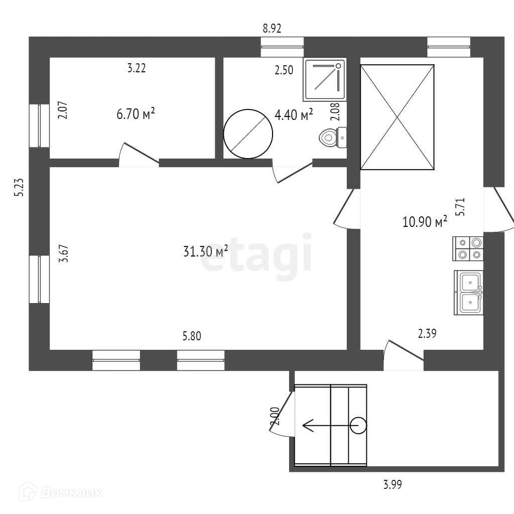 В просторных сенях обустроена кухня с бытовой техникой. Здесь вы можете собираться семьей вечерами за большим столом.