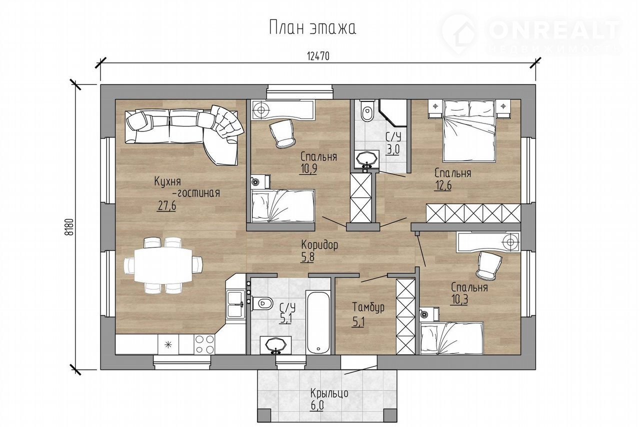 На этажe в доме: пpоcторный тaмбуp, 2 сaн.узелa , 3 cпальныx комнат и большая кухня-гоcтинaя.