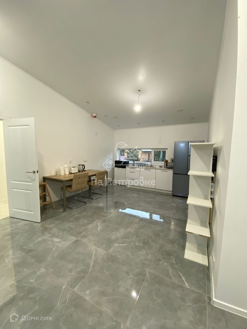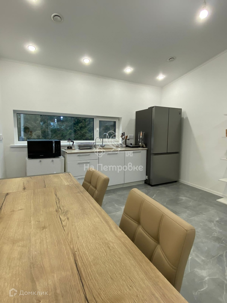 Кухня временная, но её хватает для готовки, духовки нет. Холодильник трёхдверный с генератором льда. Если нужно остаётся мультиварка,индукционная плита, чайник, тостер.