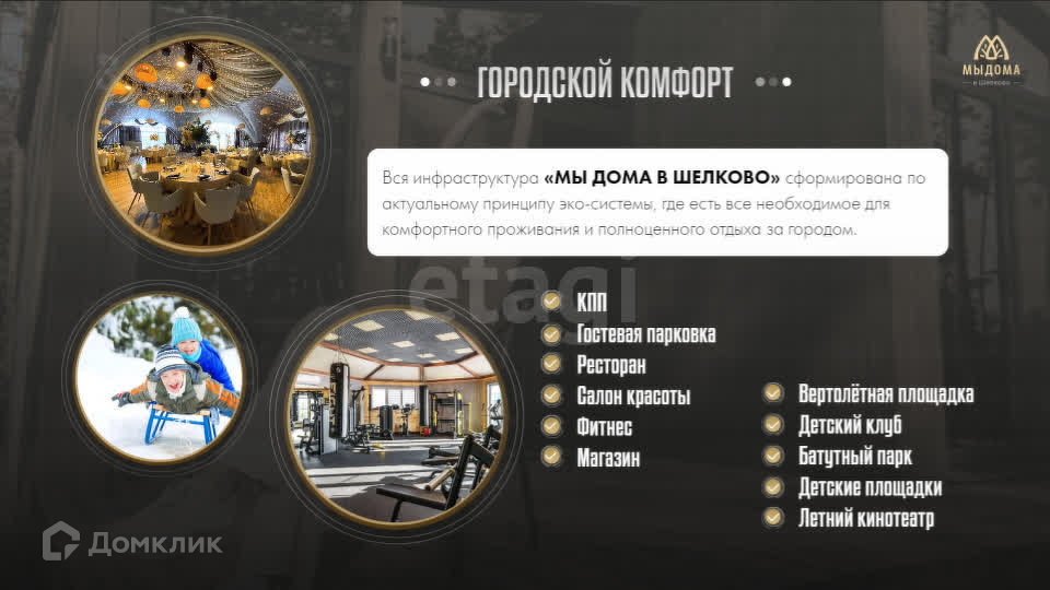 Вся инфраструктура «МЫ ДОМА В ШЕЛКОВО» сформирована по актуальному принципу эко-системы, где есть все необходимое для комфортного проживания и полноценного отдыха за городом.