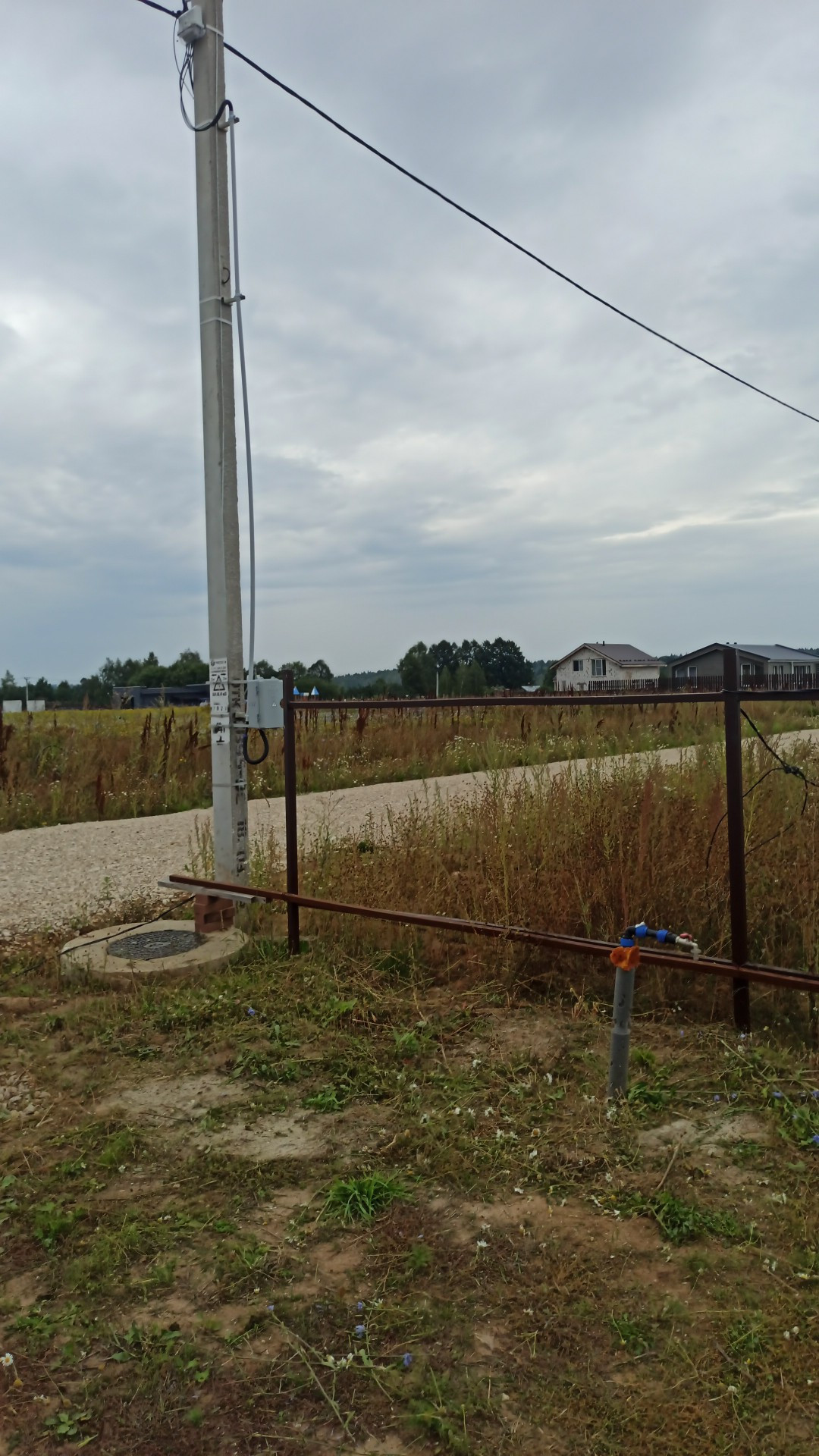 На участке уже ЕСТЬ коммуникации: центральная вода подведена и сделан вывод на поверхность, можно пользоваться, электричество 15 кВт заведено (прямой договор с МосЭнерго). Газ идёт по границе.