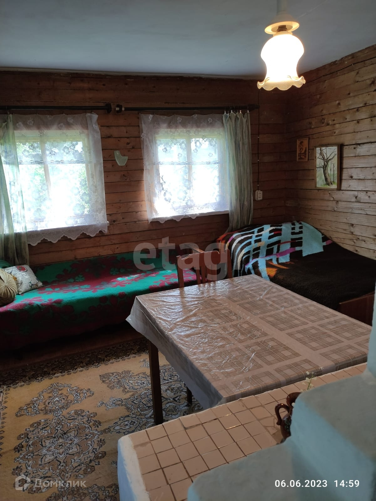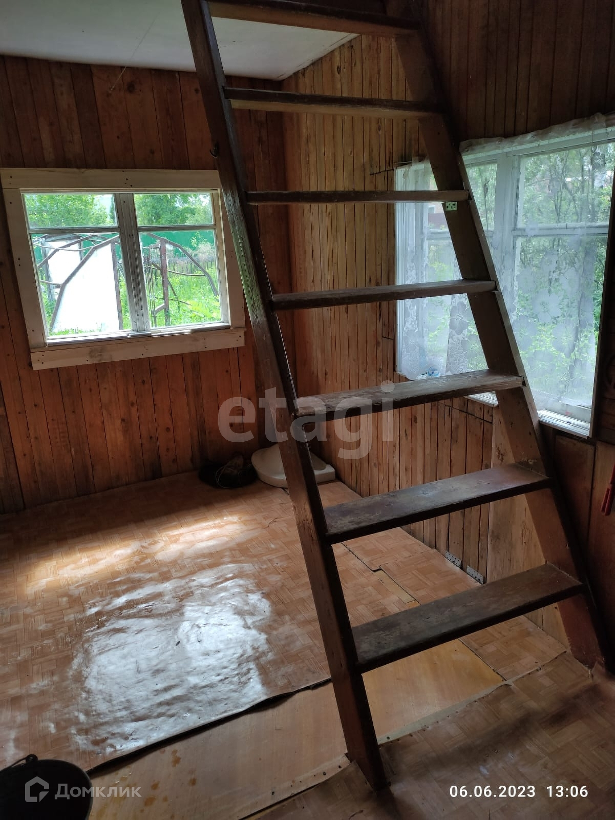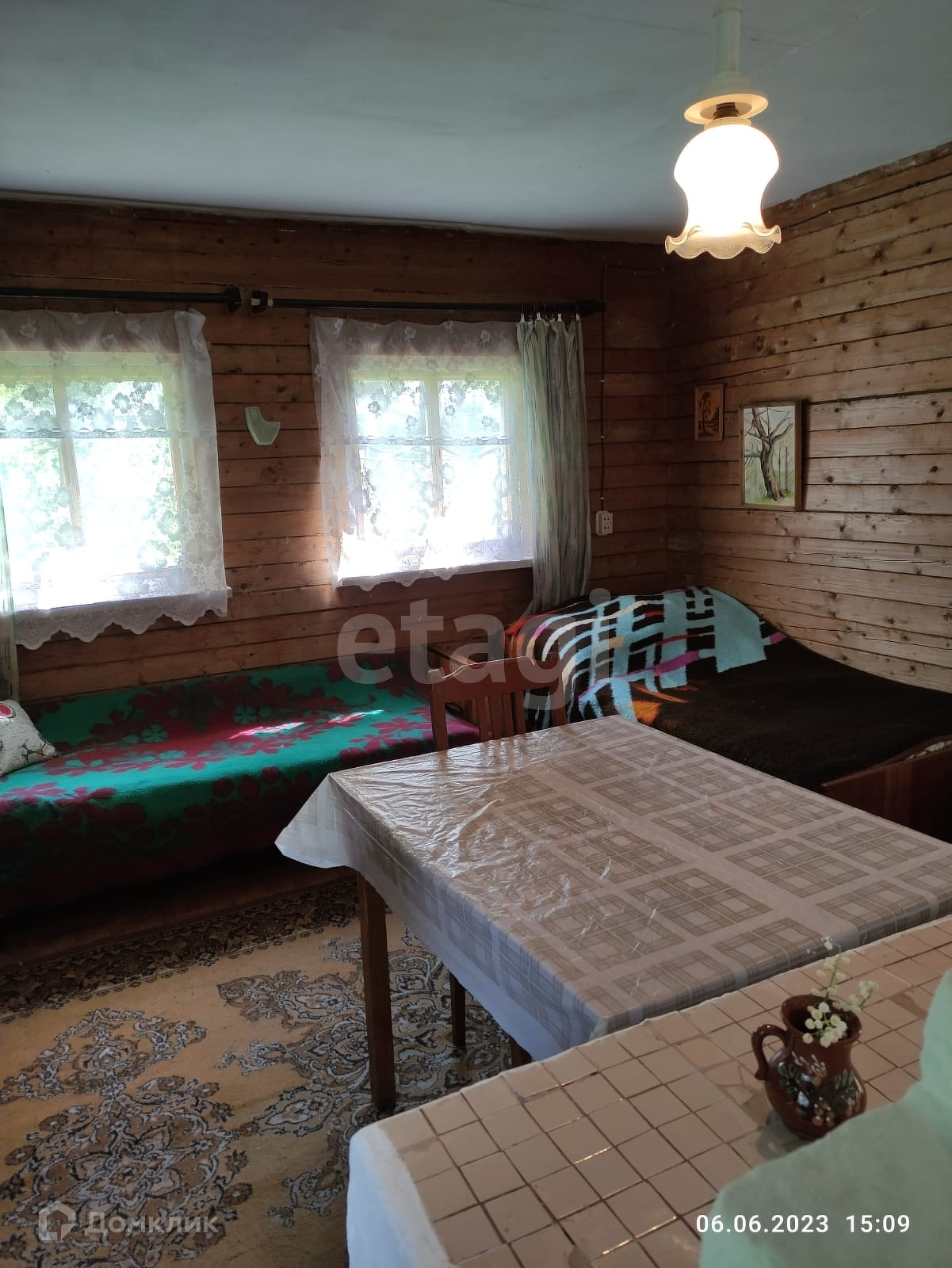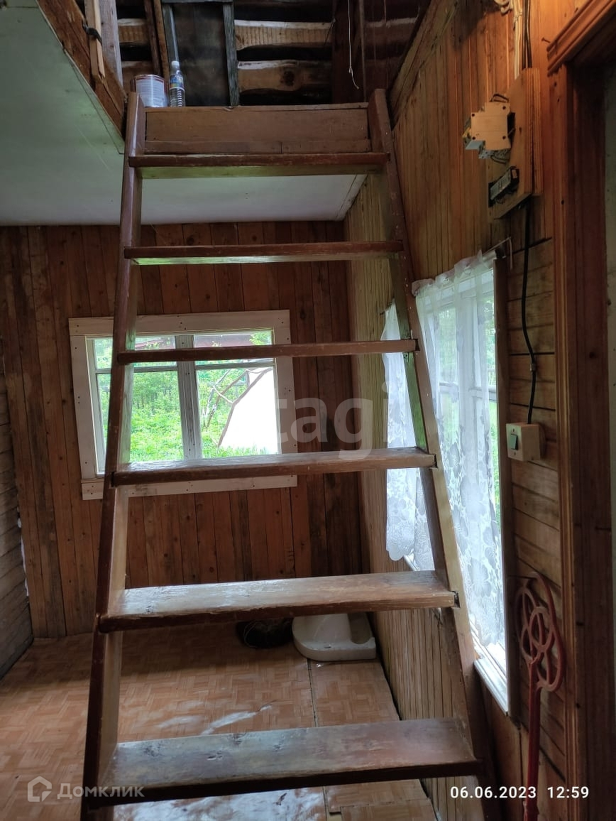 Дом построен из бруса, фундаментом служат заливные бетонные блоки. На первом этаже оборудована теплая спальная комната, летняя кухня и небольшая веранда. На втором этаже, под крышей, обустроены летние спальные места.