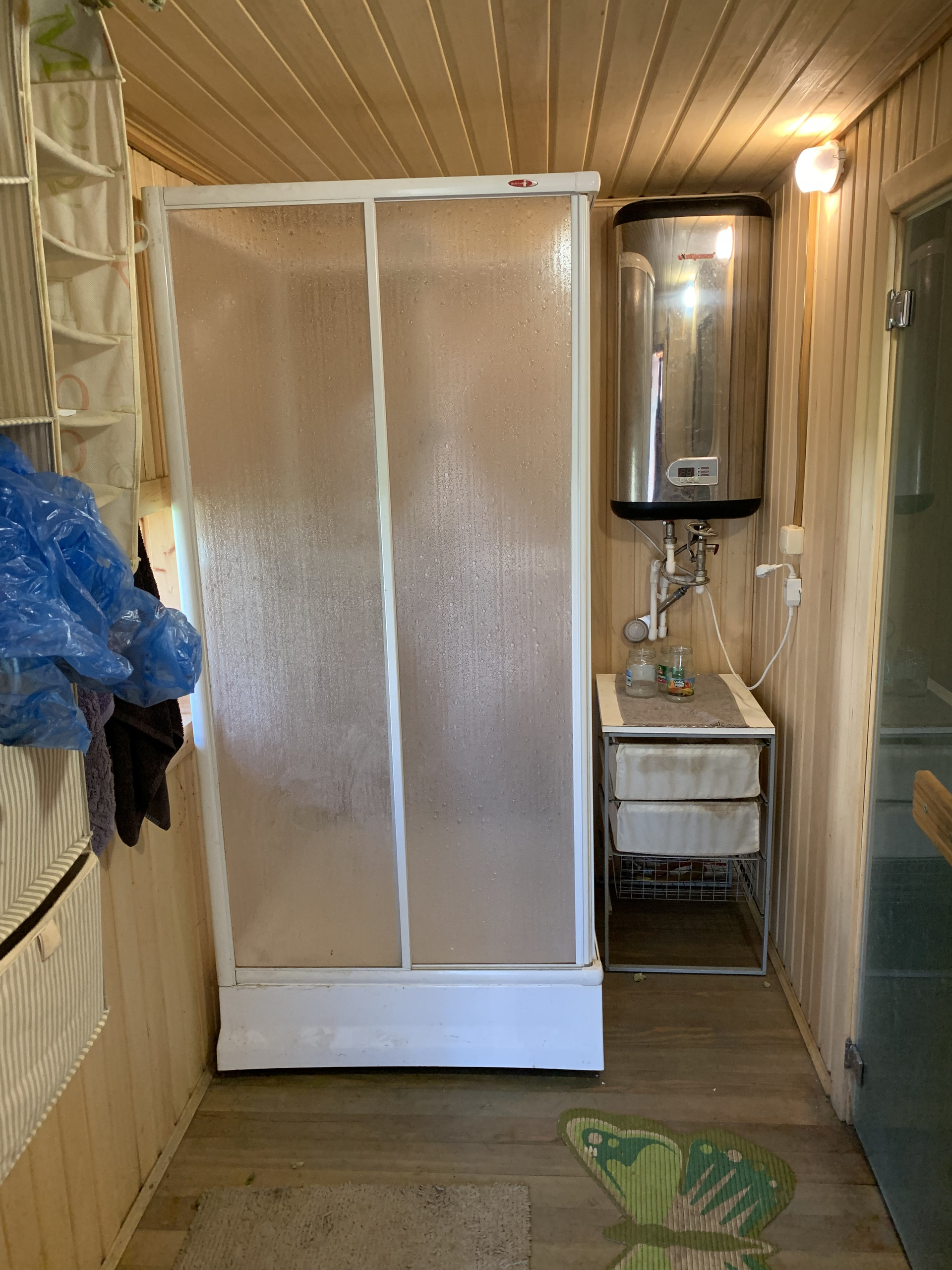 На первом этаже: гостевой санузел, гостиная с камином, печь, кладовка, кухня-столовая, санузел с душевой с подогревом пола, котельная.