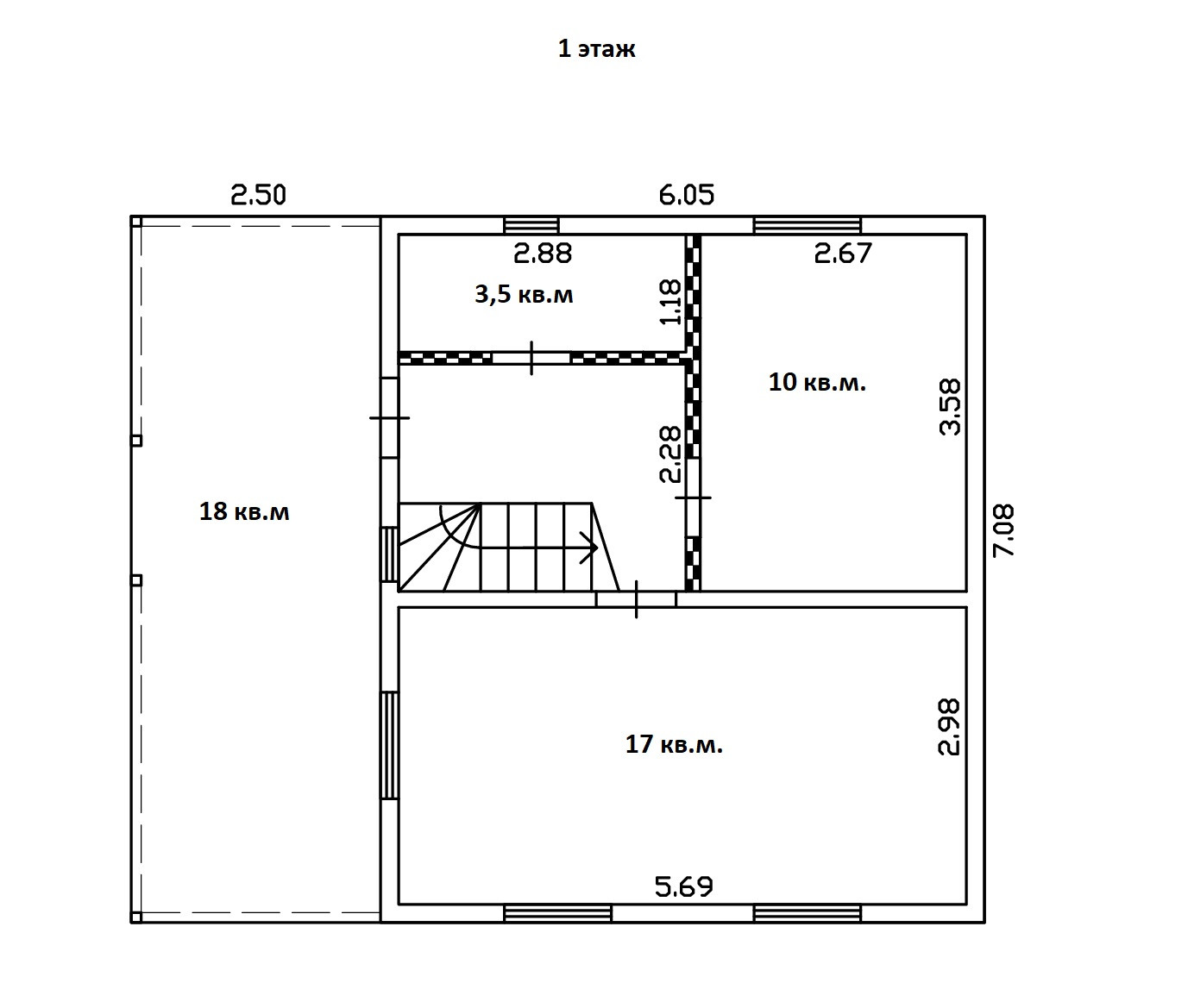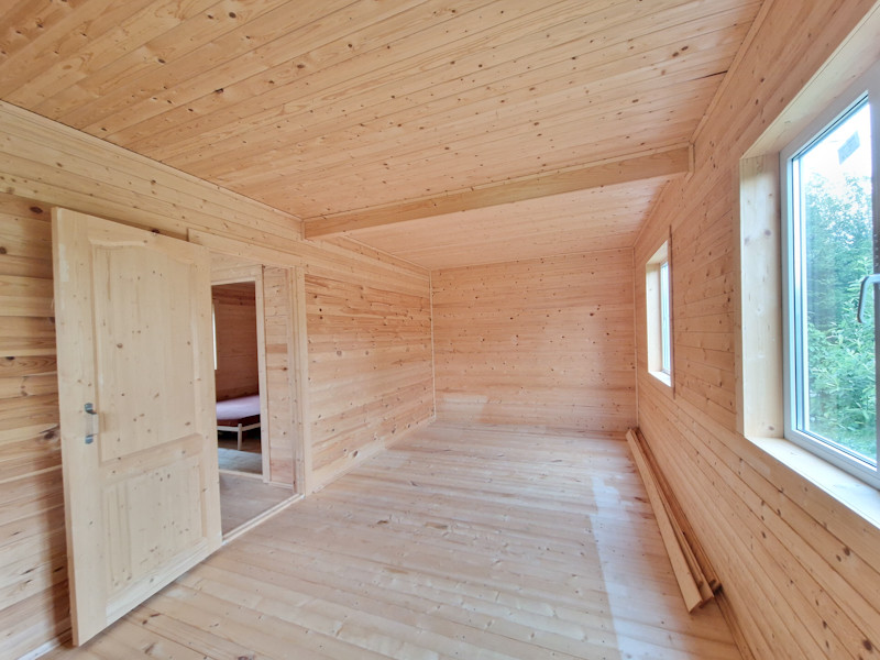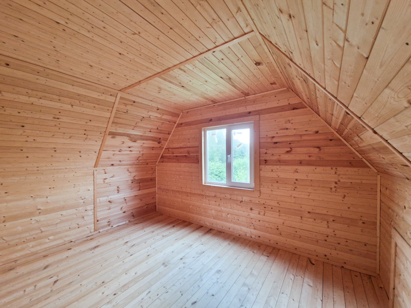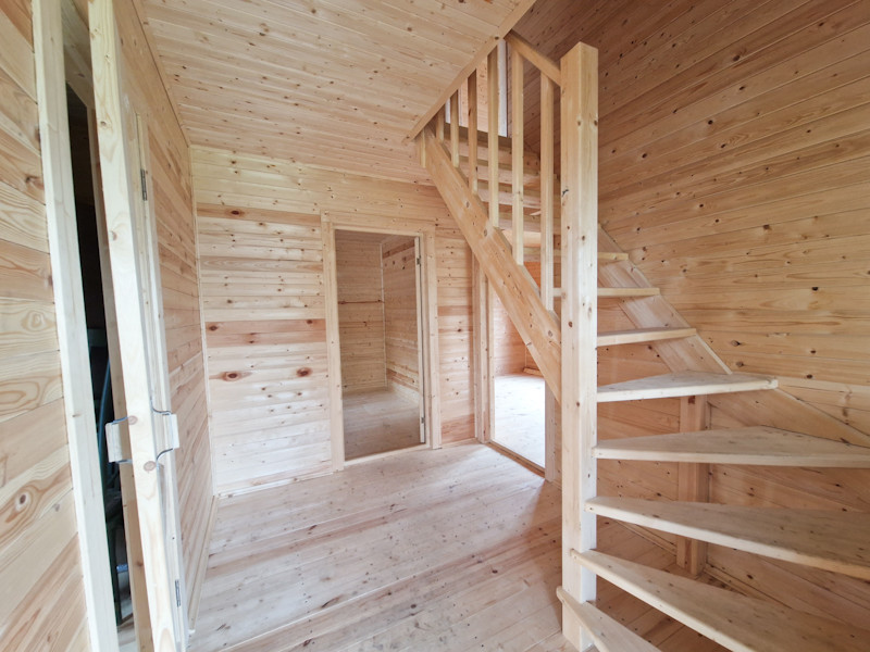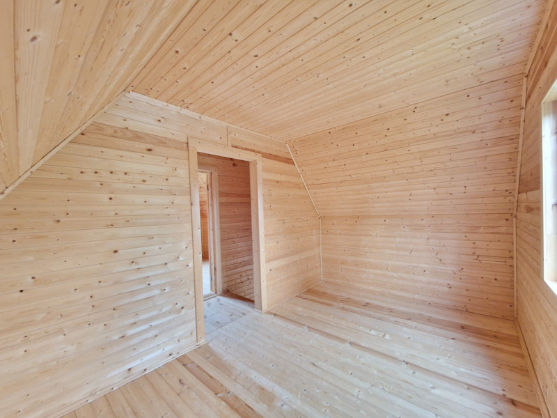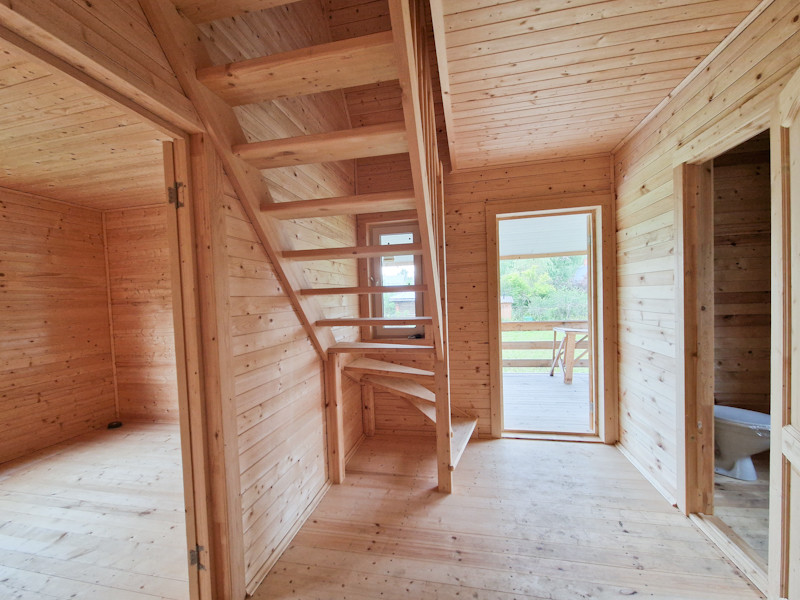 На первом этаже кухня-гостиная, санузел, прихожая, спальня. На втором этаже две спальни.
