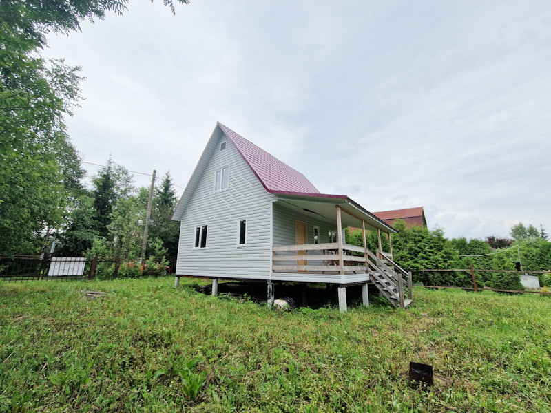 Двухэтажный каркасный дом 85 кв.м., отделан сайдингом, утеплен пеноплексом. расположен на участке 6 сотки. Коммуникации: свет, вода-колодец, канализация-септик.