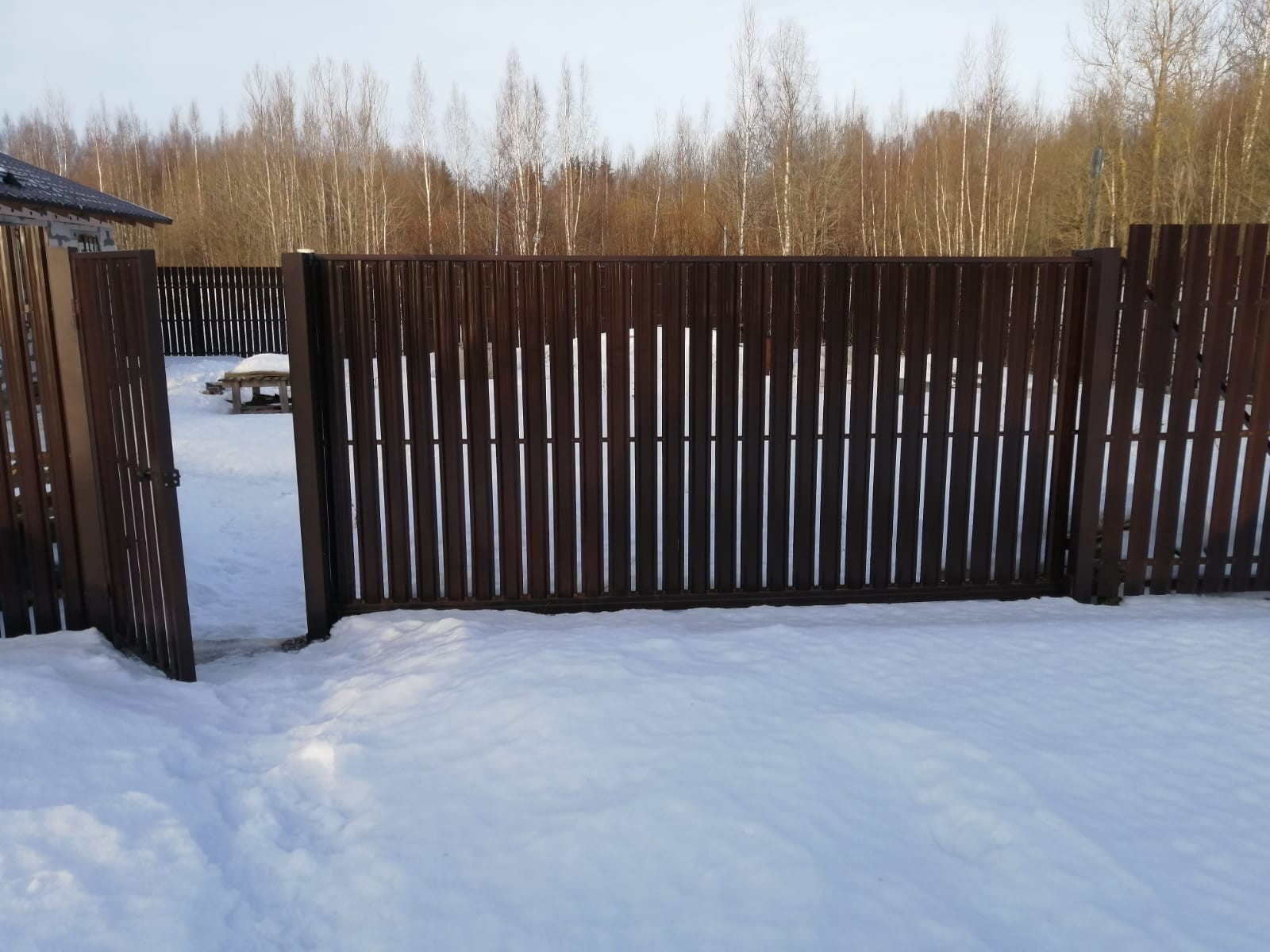 Участок огорожен забором с откатными воротами, есть площадка для установки электропривода.