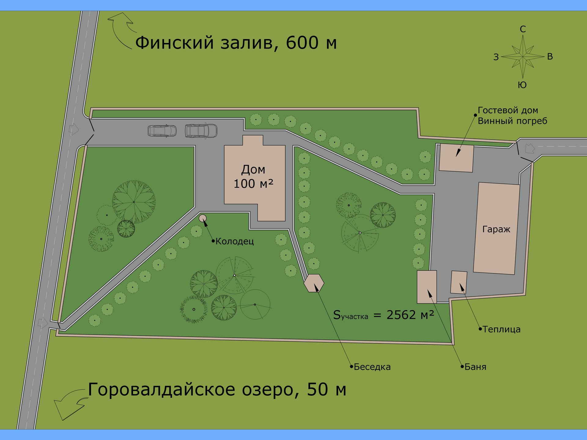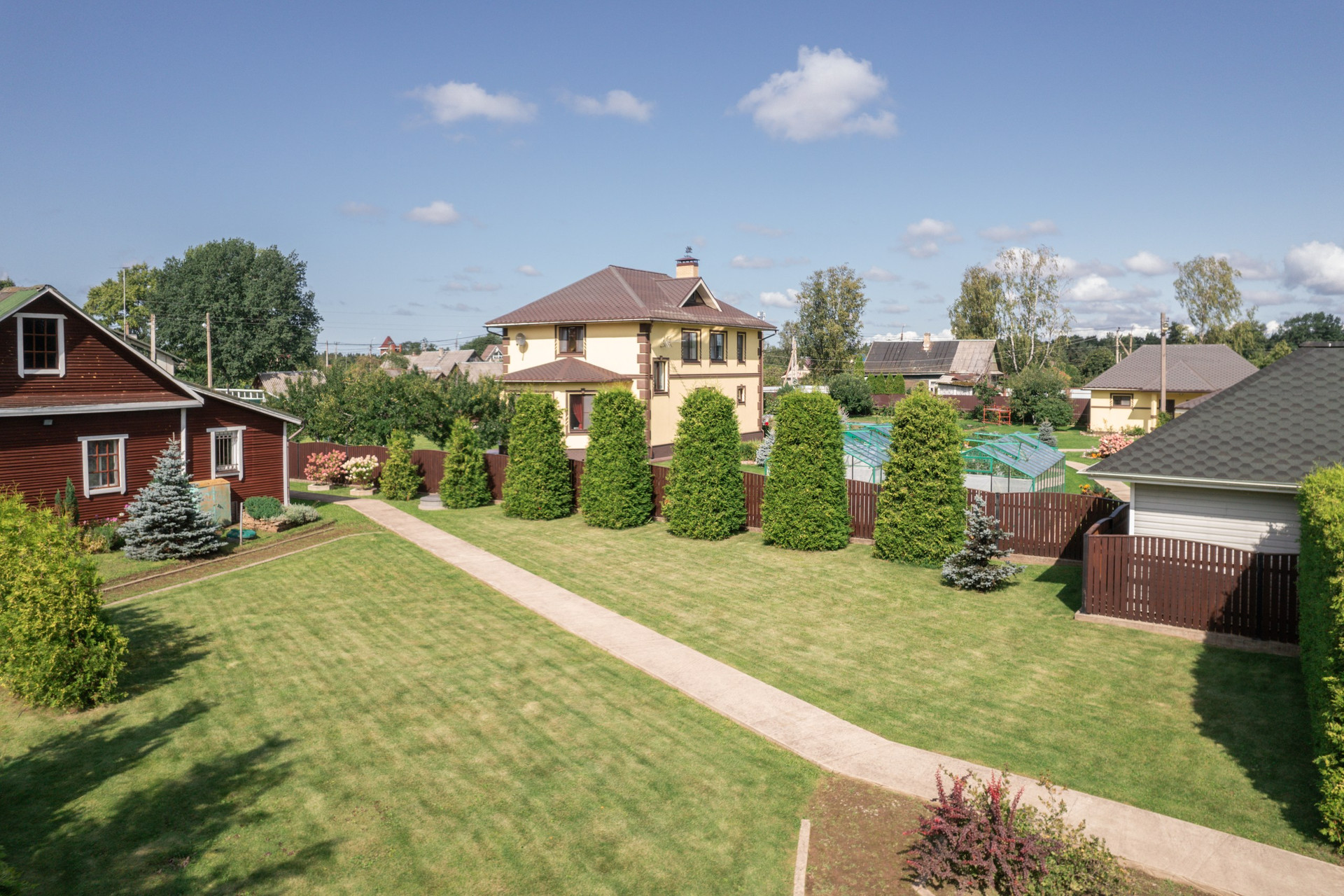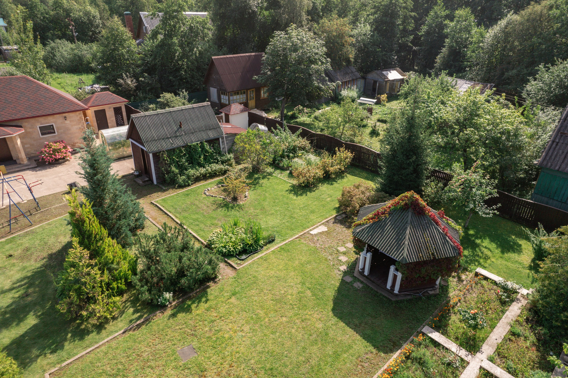Полностью благоустроен, с ландшафтным дизайном, дренажом и зелёным газоном. Он высокий, ровный, высажен фруктовый сад, декоративные деревья, плодовые кустарники, десятки хвойных пород, в том числе редкие виды туй, стелющиеся и высокорослые сосны, голубые ели, можжевельник, пихта