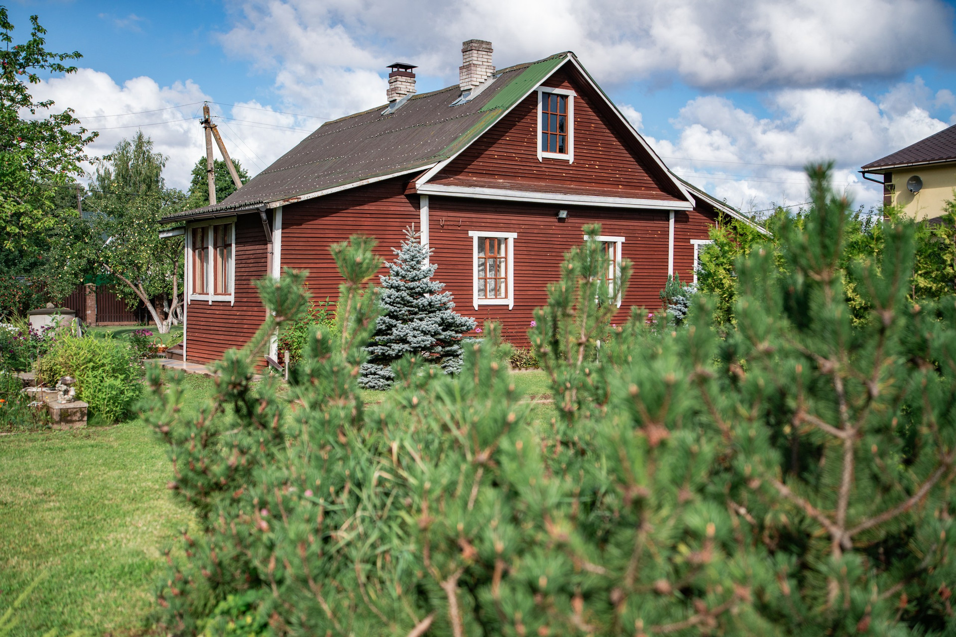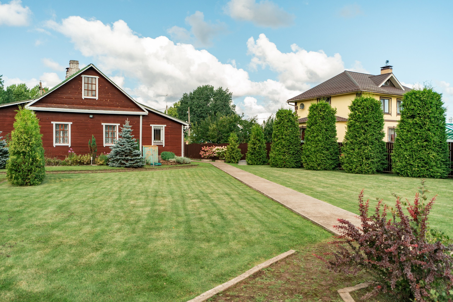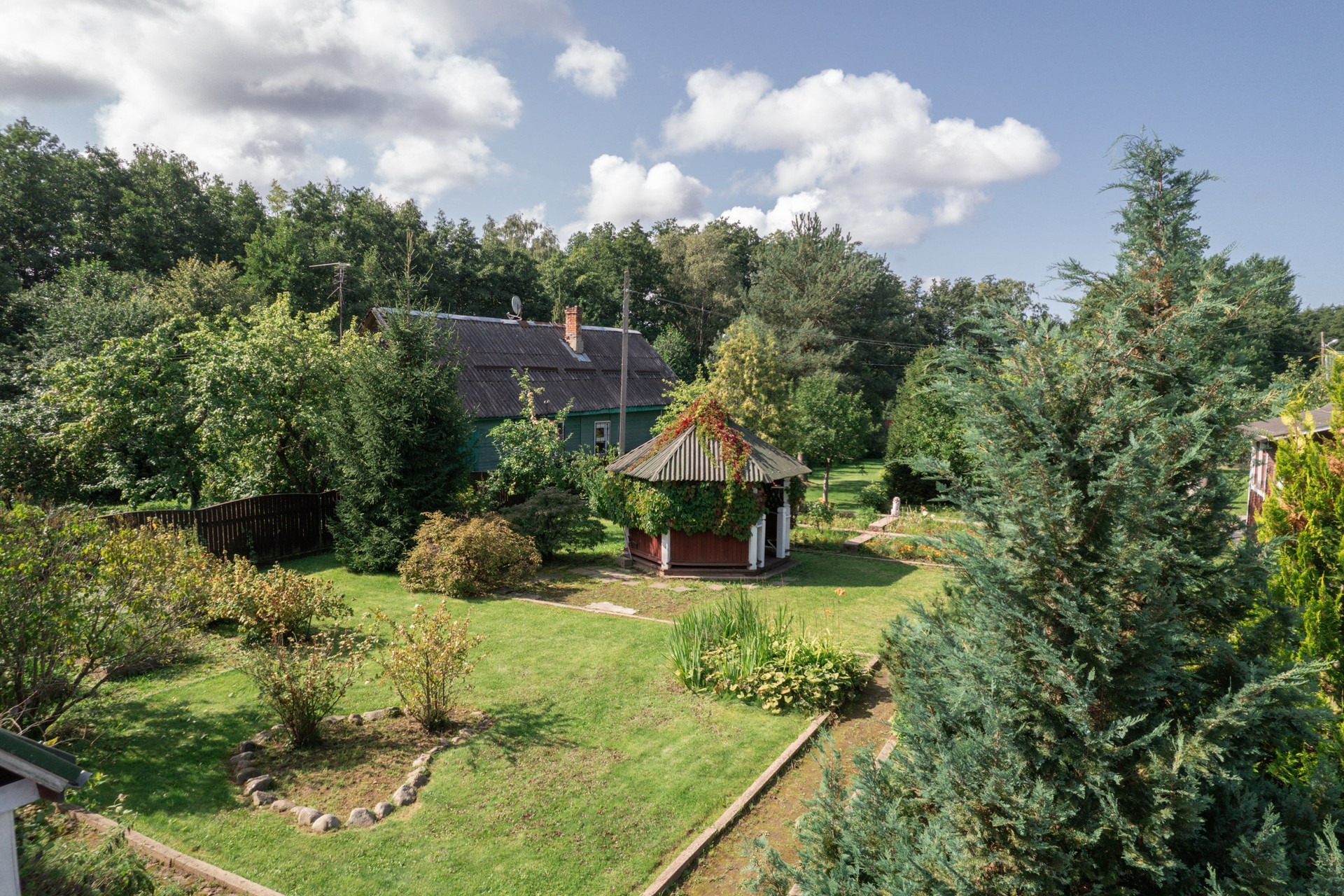 Полностью благоустроен, с ландшафтным дизайном, дренажом и зелёным газоном. Он высокий, ровный, высажен фруктовый сад, декоративные деревья, плодовые кустарники, десятки хвойных пород, в том числе редкие виды туй, стелющиеся и высокорослые сосны, голубые ели, можжевельник, пихта