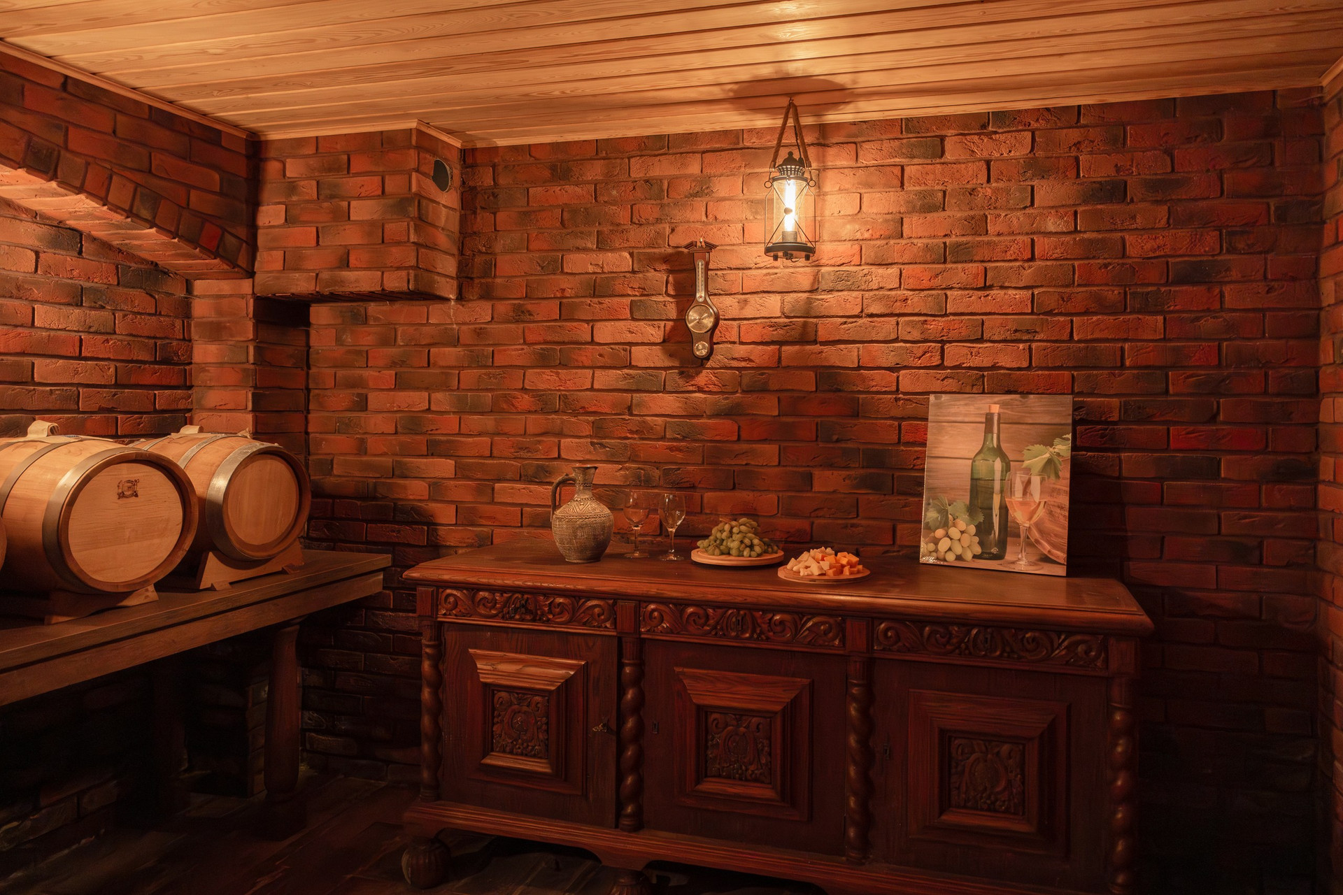 Это отдельная постройка с кухней и местом для сбора гостей, внизу которой расположен настоящий винный погреб. Это уникальное пространство, где создан климат для производства и хранения вина, заданная температура и влажность воздуха здесь держится круглый год. Если вас привлекает искусство виноделия, вам точно стоит сюда заглянуть и оценить самому!